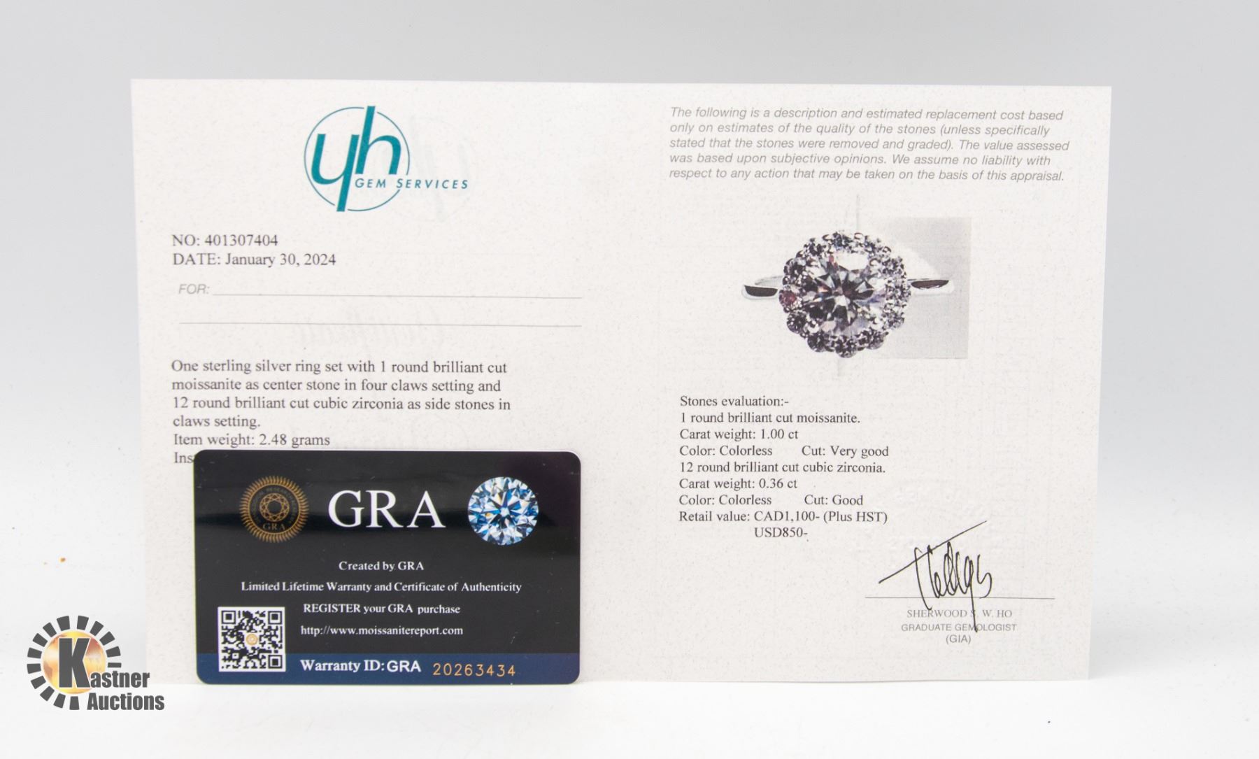 CENTER STONE WITH 12 ROUND BRILLIANT MOISSANITE WEIGHING A TOTAL 0.36 CT TW SET IN STERLING SILVER RING SIZE ADJUSTABLE RETAIL VALUE $1,100.00 **ALL ITEMS MUST BE REMOVED BY 5PM SATURDAY, MARCH 9TH 2024. ALL REMAINING ITEMS WILL BE SUBJECT TO A $6.00 PER DAY STORAGE CHARGE. ANY ITEMS REMAINING AFTER MONDAY, APRIL 1ST, 2023 WILL BE CONSIDERED FORFEITED. NO REFUNDS WILL BE ISSUED FOR FORFEITED ITEMS. TO SCHEDULE A PICK UP APPOINTMENT CLICK HERE