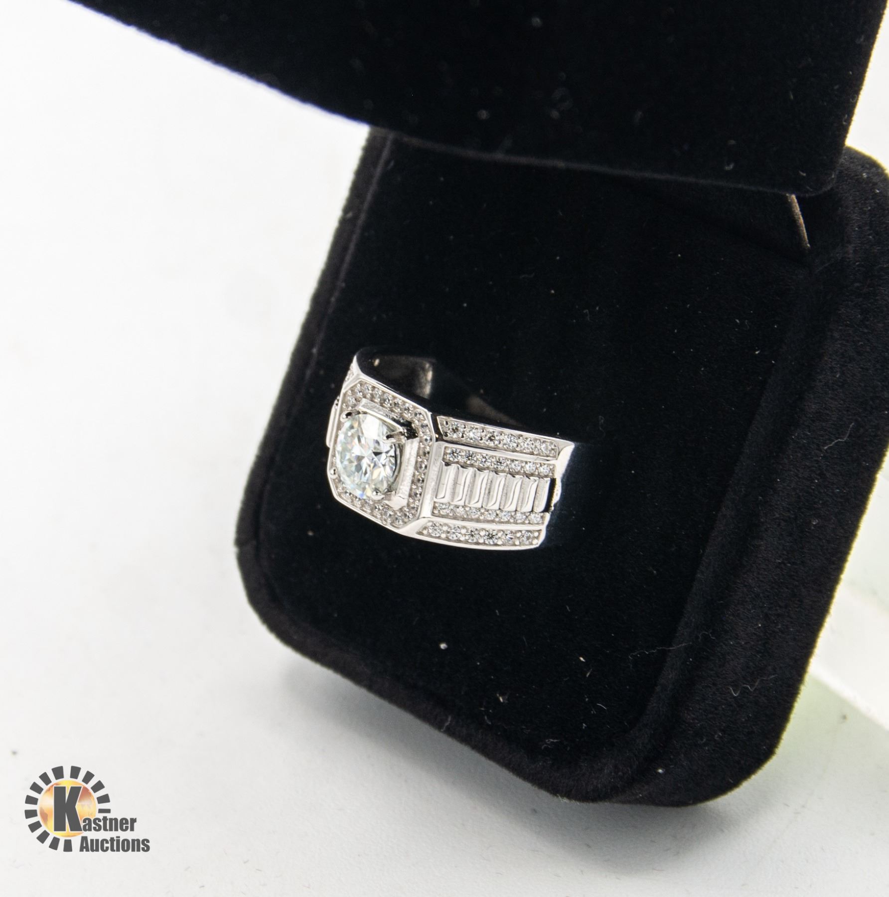 CUBIC ZIRCONIA SET IN SQUARE SHAPED HALO WITH MORE SET IN 2 LINES ON EACH SIDE OF RING THE 84 ROUND CUT CZ SET IN STERLING SILVER RING SIZE 10 RETAIL VALUE $1,200.00 **ALL ITEMS MUST BE REMOVED BY 5PM SATURDAY, MARCH 16TH 2024. ALL REMAINING ITEMS WILL BE SUBJECT TO A $6.00 PER DAY STORAGE CHARGE. ANY ITEMS REMAINING AFTER MONDAY, APRIL 8TH, 2023 WILL BE CONSIDERED FORFEITED. NO REFUNDS WILL BE ISSUED FOR FORFEITED ITEMS. TO SCHEDULE A PICK UP APPOINTMENT CLICK HERE