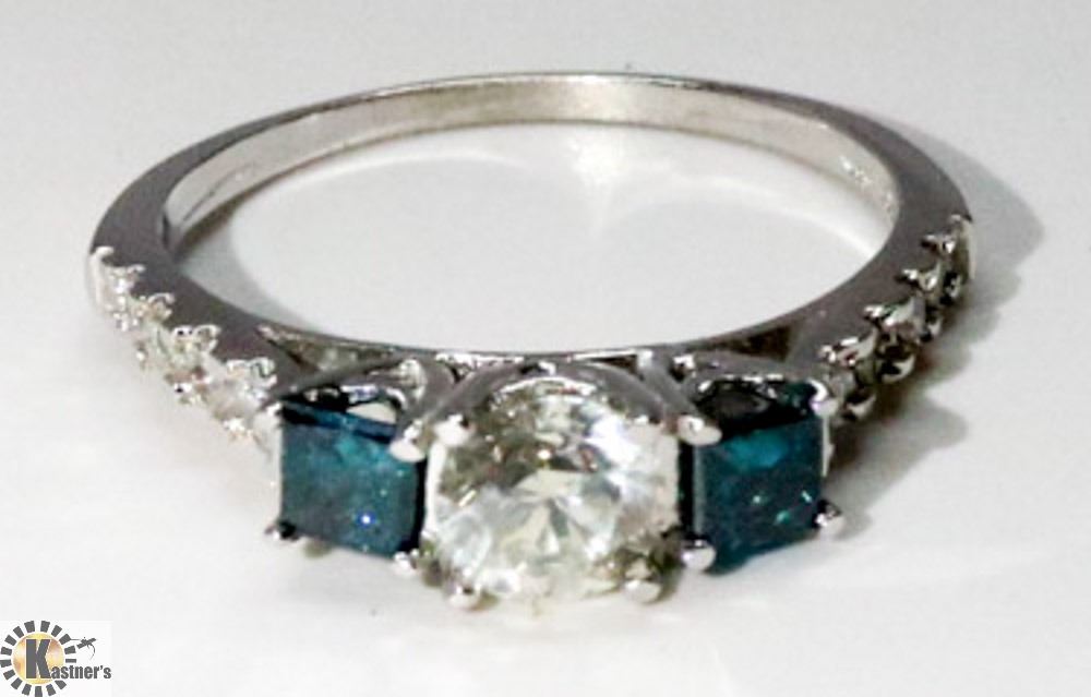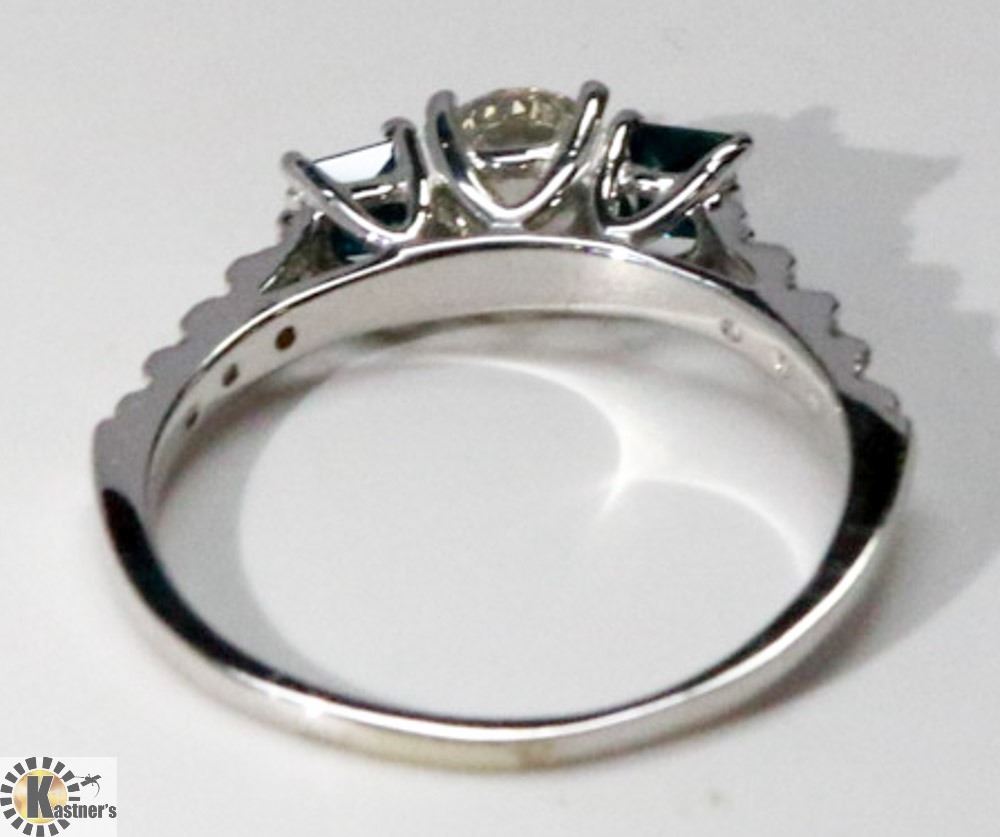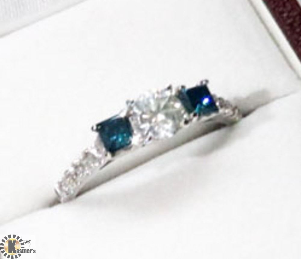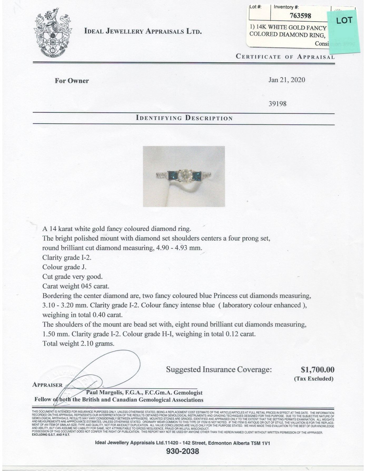 SIZE 6.5, ONE ROUND BRILLIANT CUT DIAMOND (CLARITY GRADE I-2, COLOR GRADE J, CUT GRADE VERY GOOD, CARAT WEIGHT 0.45 CARAT), TWO FANCY COLORED BLUE PRINCESS CUT DIAMONDS (CLARITY GRADE I-2, COLOR FANCY INTENSE BLUE [LAB ENHANCED], TOTAL CARAT WEIGHT 0.40 CARATS), EIGHT ROUND BRILLIANT CUT DIAMONDS (CLARITY GRADE I-2, COLOR GRADE H-I, WEIGHING TOTAL OF 0.12 CARATS). COMES WITH CERTIFICATE OF APPRAISAL FROM LOCAL APPRAISER, SUGGESTED INSURANCE COVERAGE $1,700.00. JEWELLERY