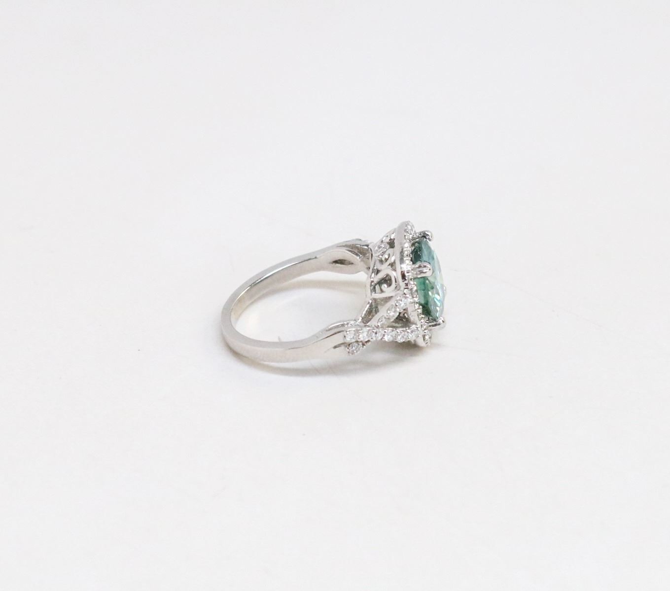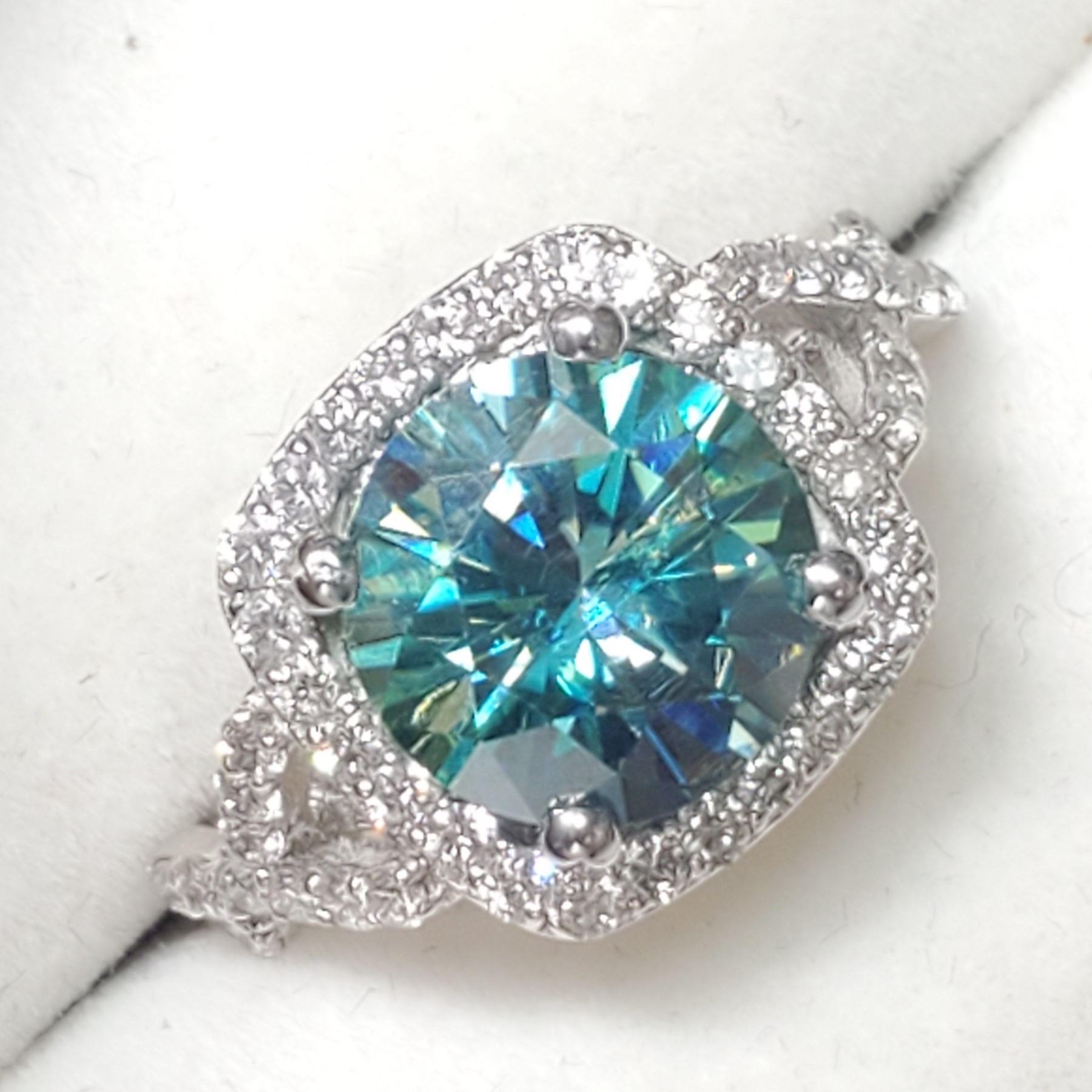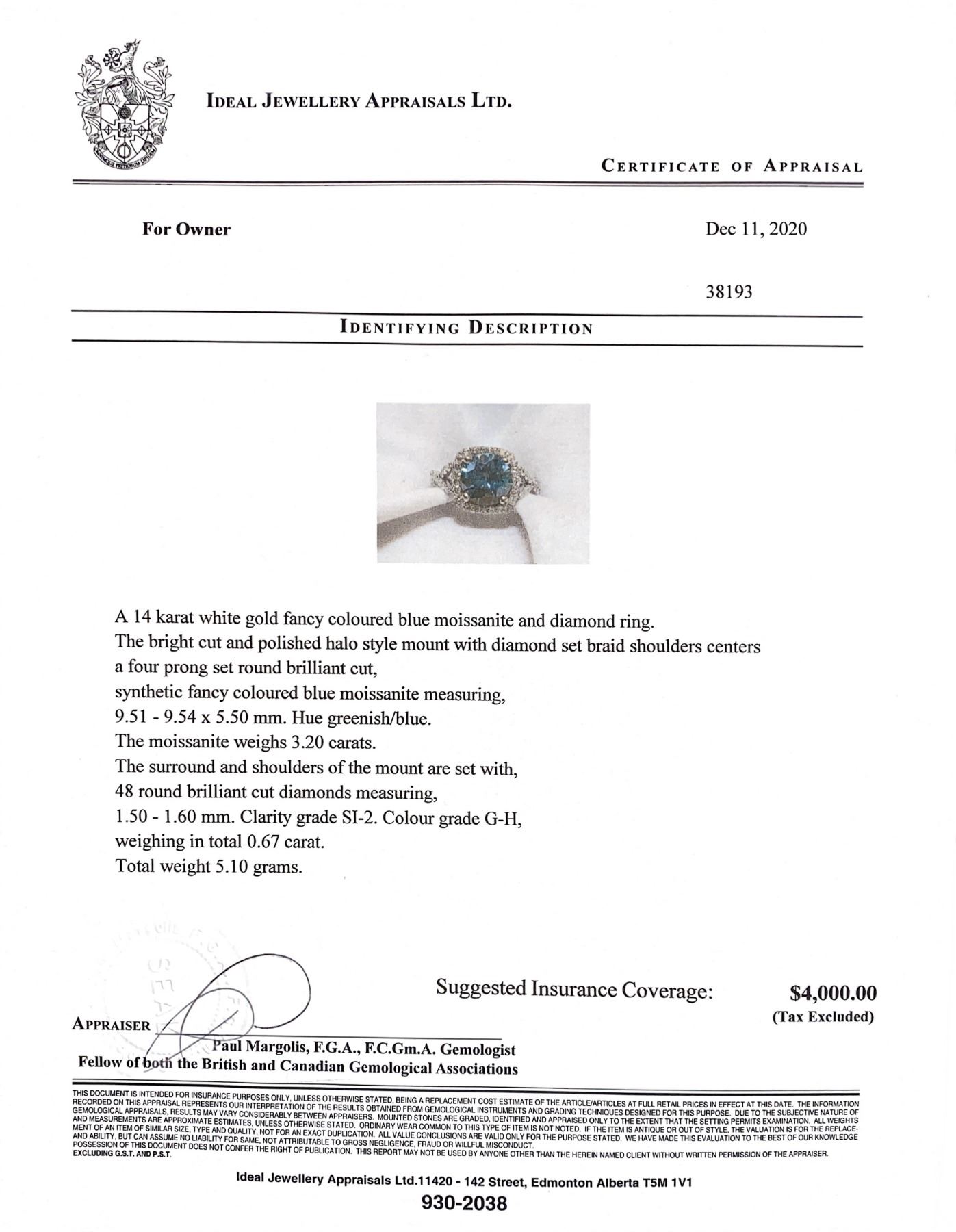 14K WHITE GOLD FANCY COLORED MOISSANITEDIAMOND RING SIZE 6.5, THE BRIGHT CUT AND POLISHED HALO STYLE MOUNT WITH DIAMOND SET BRAID SHOULDERS CENTERS A FOUR PRONG SET ROUND SET BRILLIANT CUT, SYNTHETIC FANCY COLORED BLUE MOISSANITE MEASUREING 9.51-9.5 X 5.50MM. HUE GREENISH/BLUE. THE MOISSANITE WEIGHS 3.2 CARATS. THE SURROUND AND SHOULDERS OF THE MOUNT ARE SET WITH, 48 ROUND BRILLIANT CUT DIAMONDS MEASUREING 1.50-1.60MM. CLARITY GRADE SI-2, COLOUR GRADE G-H WEIGHING INTOTAL 0.67 CARAT . TOTAL WEIGHT 5.10 GRAMS SIZE 6.5.COMES WITHCERTIFICATE OF APPRAISAL FROM LOCAL APPRAISER, SUGGESTED INSURANCE COVERAGE $4000.00. JEWELLERY