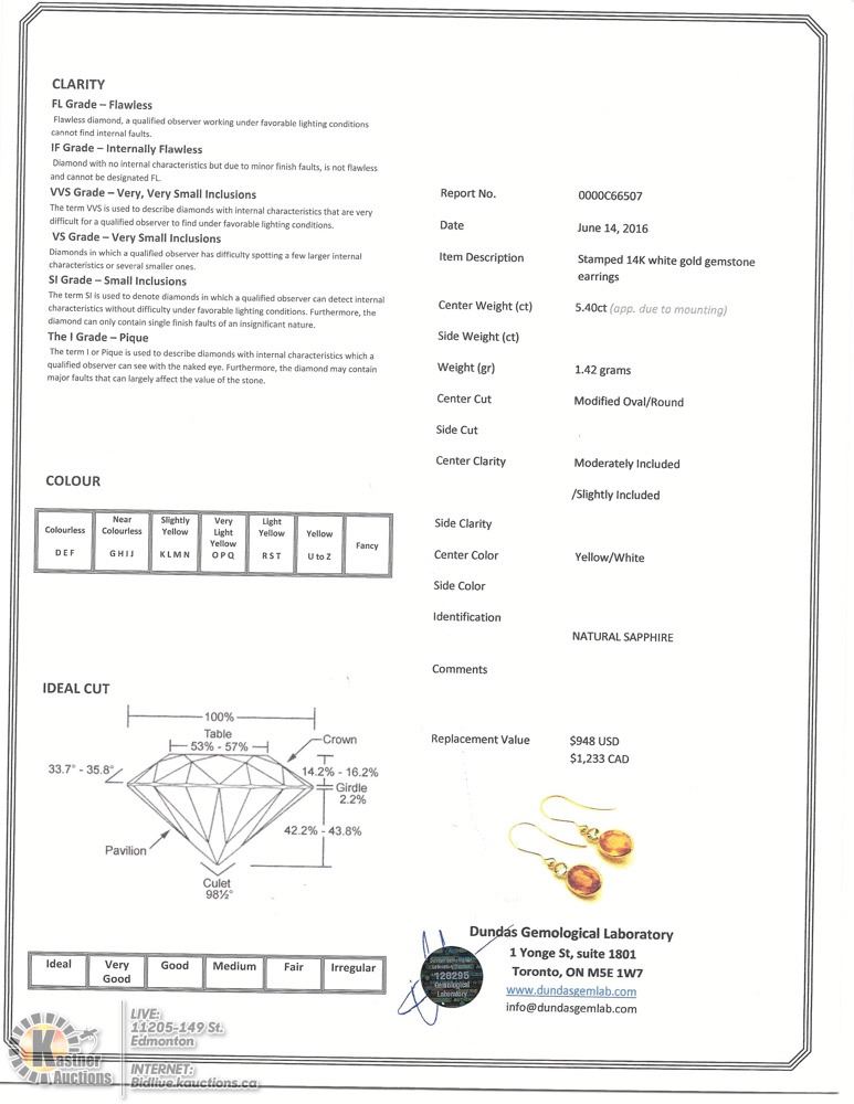 WITH COA- 1 - AC8 - 14KT WHITE GOLD YELLOW & WHITE SAPPHIRE (5.40CT) EARRINGS SUGGESTED REPLACEMENT VALUE $1,233.00