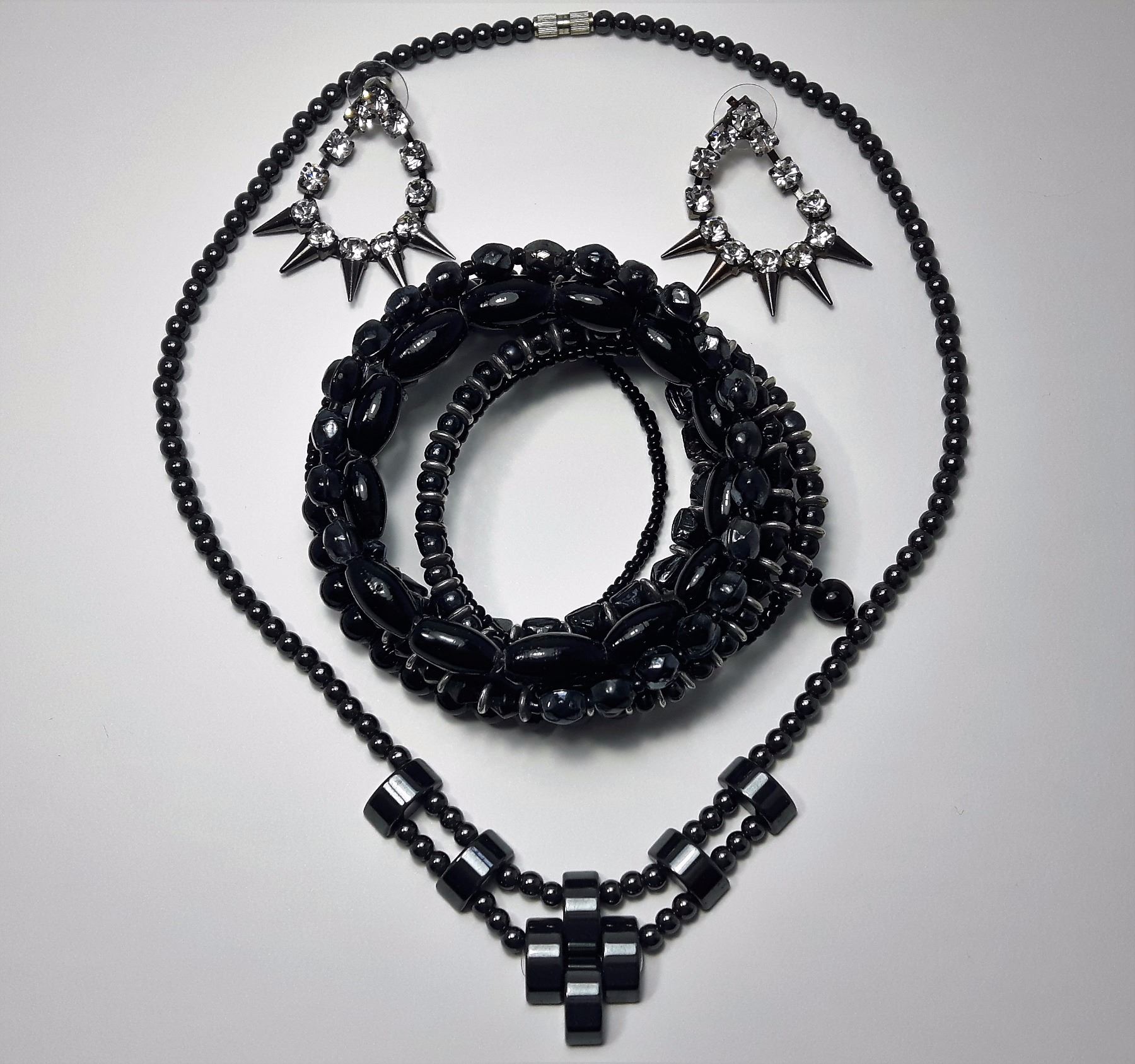 INCLUDES BLACK HEMATITE & BEAD NECKLACE, MULTI STRAND BRACELET & BLACK & CRYSTAL EARRINGS