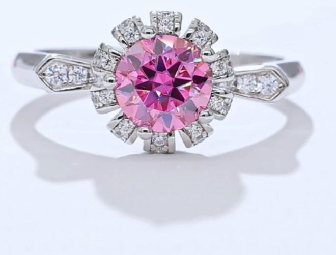 RING SZ 7.5 PRINCESS CROWN STYLE WITH VVS D COLOR GRADE CENTRAL MOISSANITE STONE. COMES WITH ITS BOX. M44A-PINK