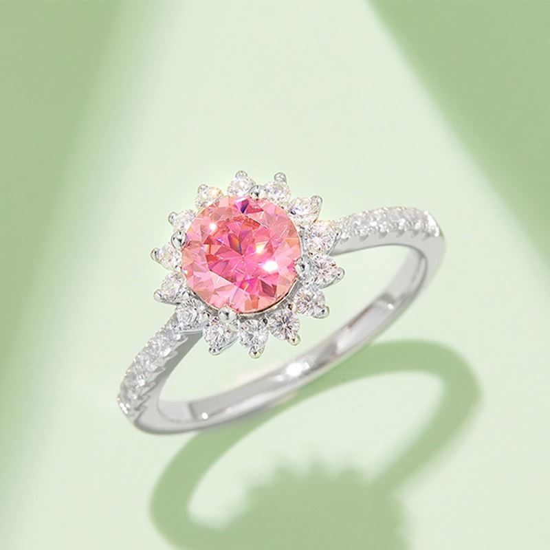 SZ 7.5 MICROPAVED SNUNFLOWER DESIGN RING WITH VVS D COLOR GRADE CENTRAL MOISSANITE STONE. COMES WITH ITS BOX. M45A-PINK (COLOR BRIGHTNESS CAN SHOW DIFFERENTLY IN IMAGES)