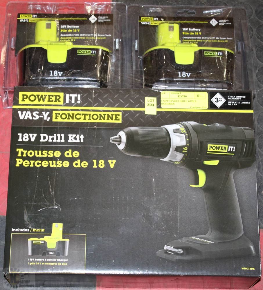 1 NEW 18 VOLT DRILL WITH 3 BATTERIES