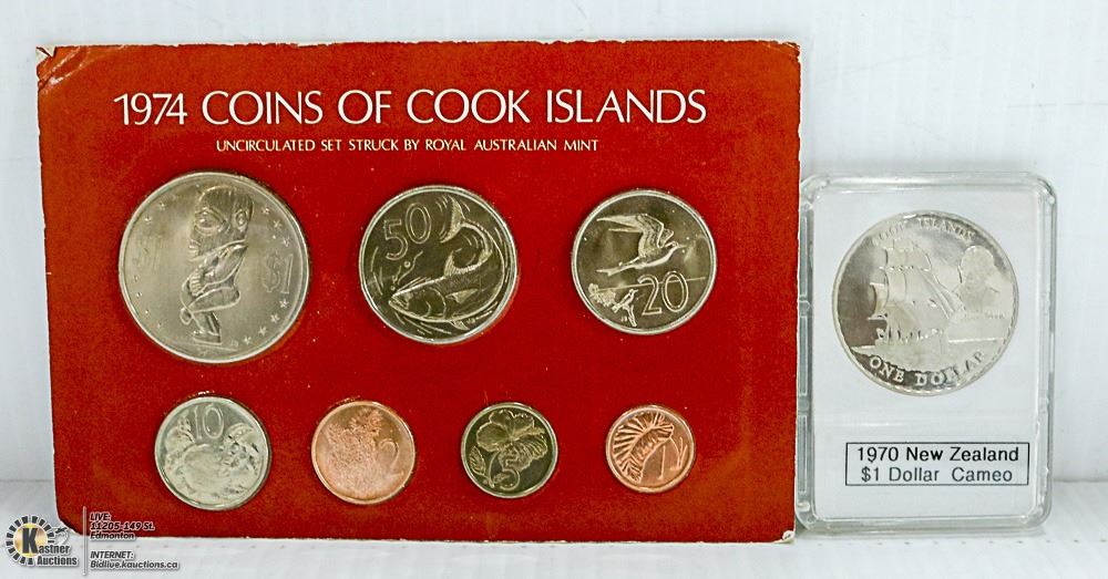 1 OZ OF .999 PURE SILVER, CAMEO FINISH, + 1974 COOK ISLANDS MINT SET. AS IT CAME FROM MINT, UNTOUCHED.