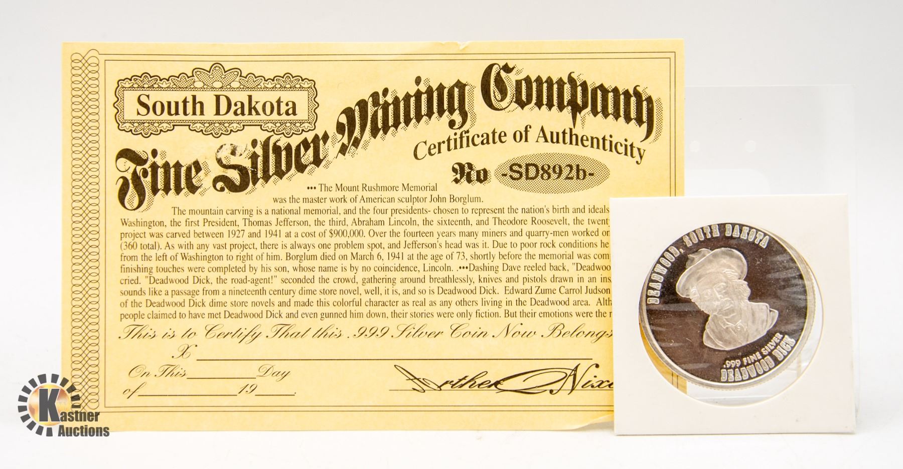 1 OZ .999 SILVER S DAKOTA MINING CO COIN W COA