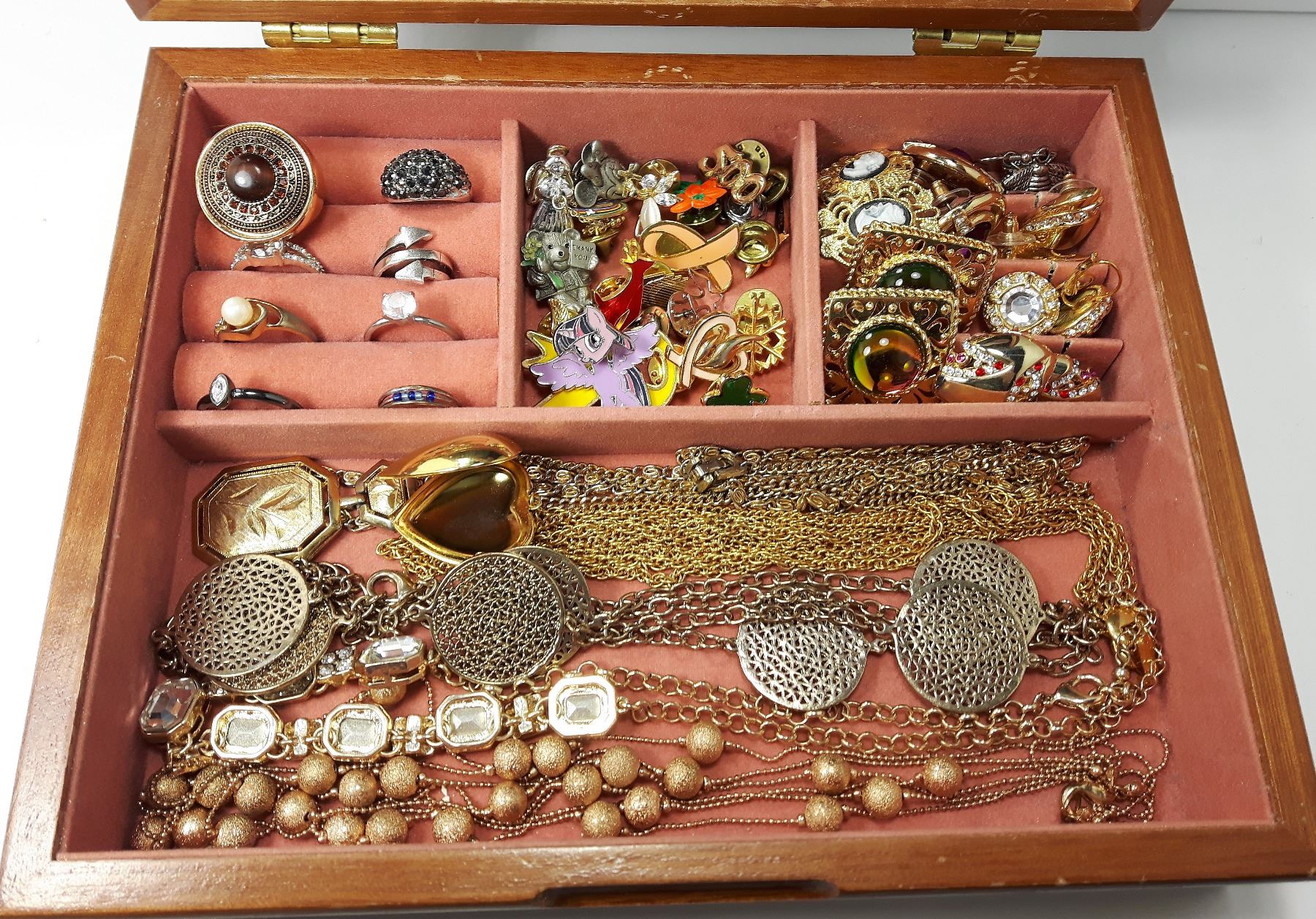 CONTENTS INCLUDE RINGS, TACK STYLE PINS, VINTAGE EARRINGS, PENDANTS AND NECKLACES. JEWELRY