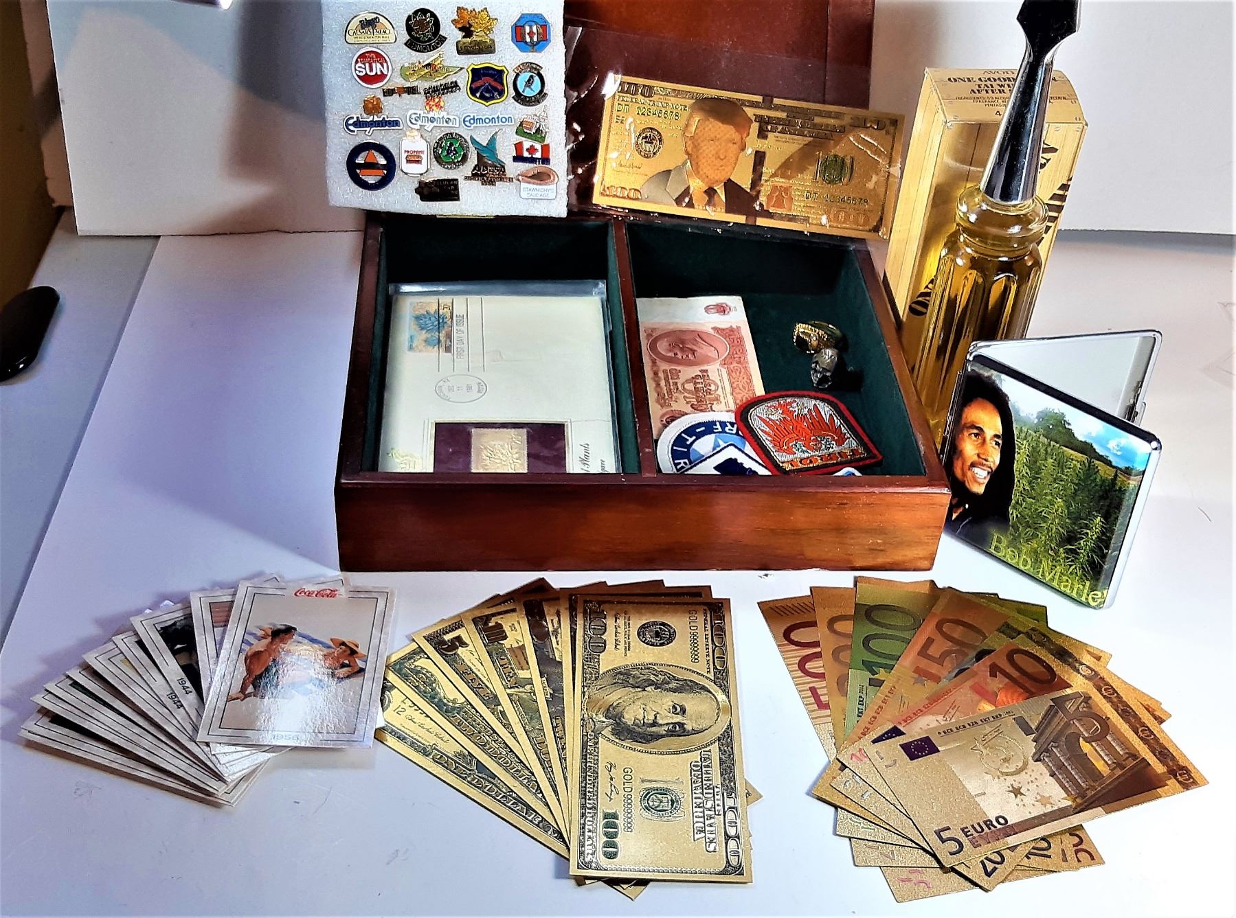 INCLUDES: LAPEL PINS, RINGS, AVON VINTAGE TAI WINDS AFTER SHAVE, BOB MARLEY CIGARETTE CASE, GOLD FOIL BANKNOTES, ETC. COLLECTIBLES