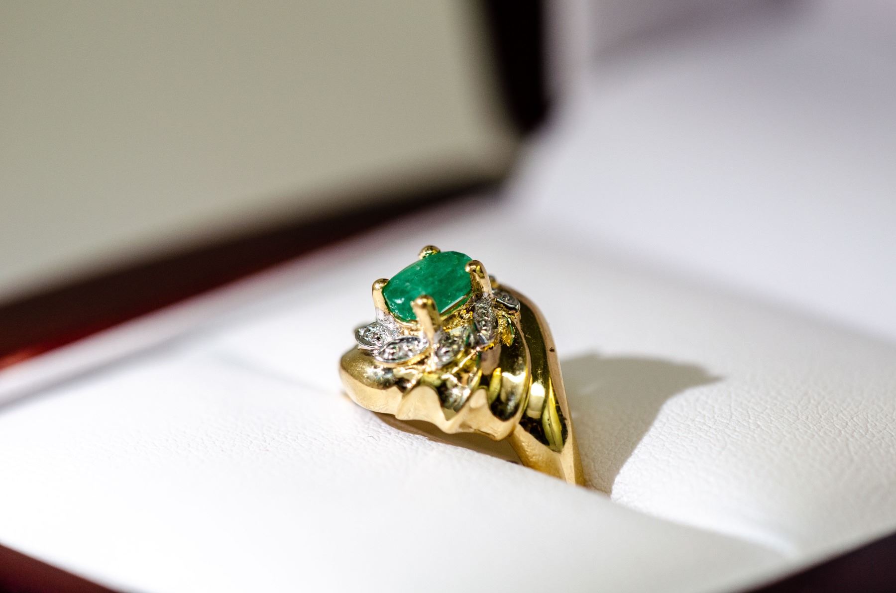 SIZE 6.25 A 10 KARAT YELLOW GOLD EMERALD AND DIAMOND RING, THE BRIGHT CUT AND POLISHED TWO TONE CLUSTER STYLE MOUNT WITH FLUTED SHOULDERS CENTERS A PRONG SET, OVAL SHAPED NATURAL EMERALD MEASURING. 620-4.15X 2.85 MM. TONE LIGHT, HUE VERY SLIGHTLY YELLOWISH/GREEN. CLARITY GRADE SEMI TRANSPARENT. THE EMERALD WEIGHS 0.40 CARAT. THE SURROUND IS BEAD SET WITH, EIGHT SINGLE CUT DIAMONDS MEASURING, 0.90 MM. CLARITY GRADE SI 1-2. COLOUR GRADE C-H, WEIGHING IN TOTAL 0.03 CARAT. TOTAL WEIGHT 3,40 GRAMS.CERTIFICATE OF APPRAISAL FROM LOCAL APPRAISER, SUGGESTED INSURANCE COVERAGE $1000.00.