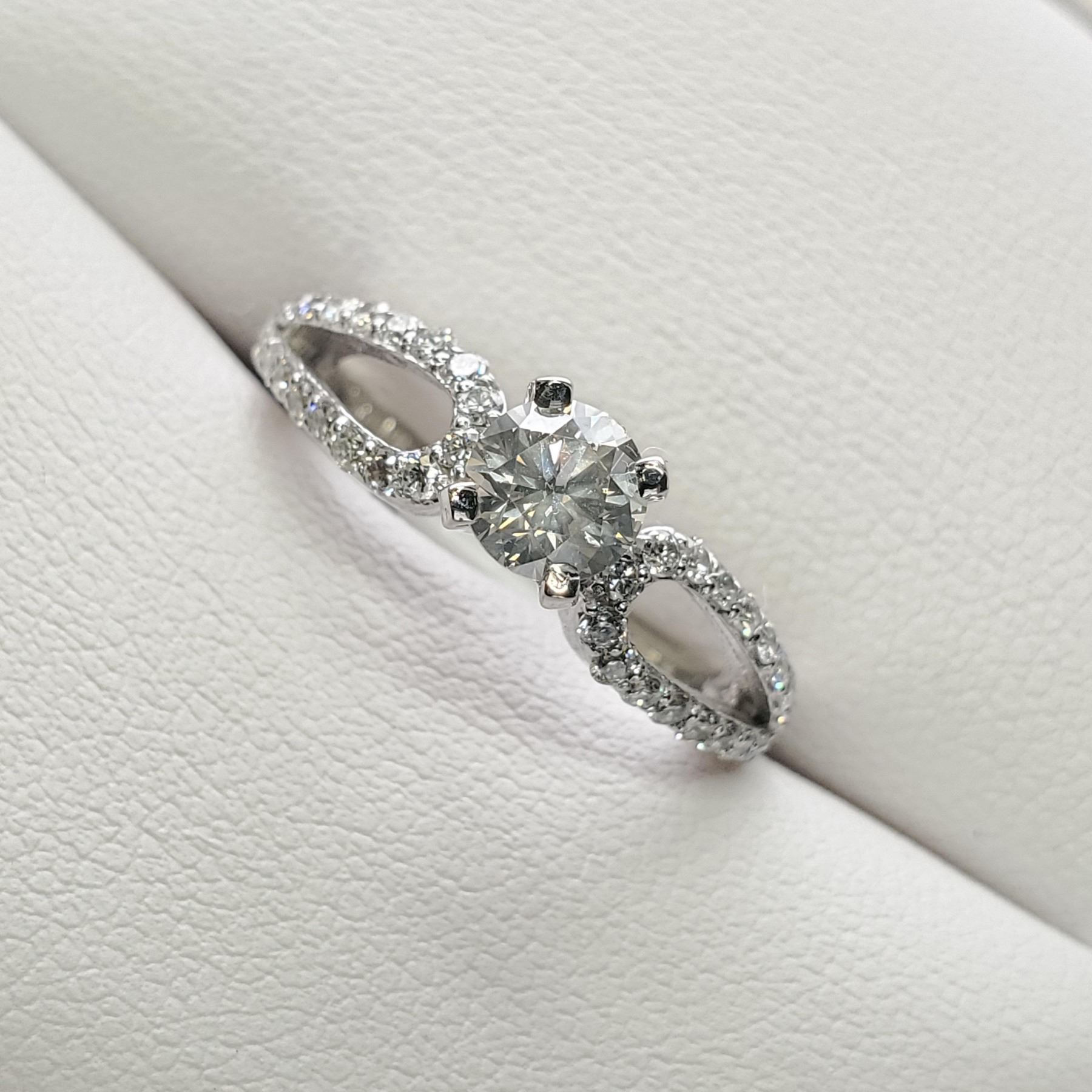 SIZE 6.5 A 10 KARAT WHITE GOLD DIAMOND RING. THE BRIGHT POLISHED MOUNT WITH DIAMOND SET SHOULDERS CENTERS A FOUR PRONG SET, ROUND BRILLIANT CUT DIAMOND MEASURING,S.35- 5.35 MM. CLARITY GRADE 1-3. COLOUR GRADE H-1. CARAT WEIGHT 0.65 CARAT. THE SHOULDERS OF THE MOUNT ARE SET WITH,38 ROUND BRILLIANT CUT DIAMONDS MEASURING. 1.30 - 1.40 MM. CLARITY GRADE SI-2. COLOUR GRADE G-H, WEIGHING IN TOTAL 0.38 CARAT. TOTAL WEIGHT 3.00 GRAMS..CERTIFICATE OF APPRAISAL FROM LOCAL APPRAISER, SUGGESTED INSURANCE COVERAGE $3500.00.