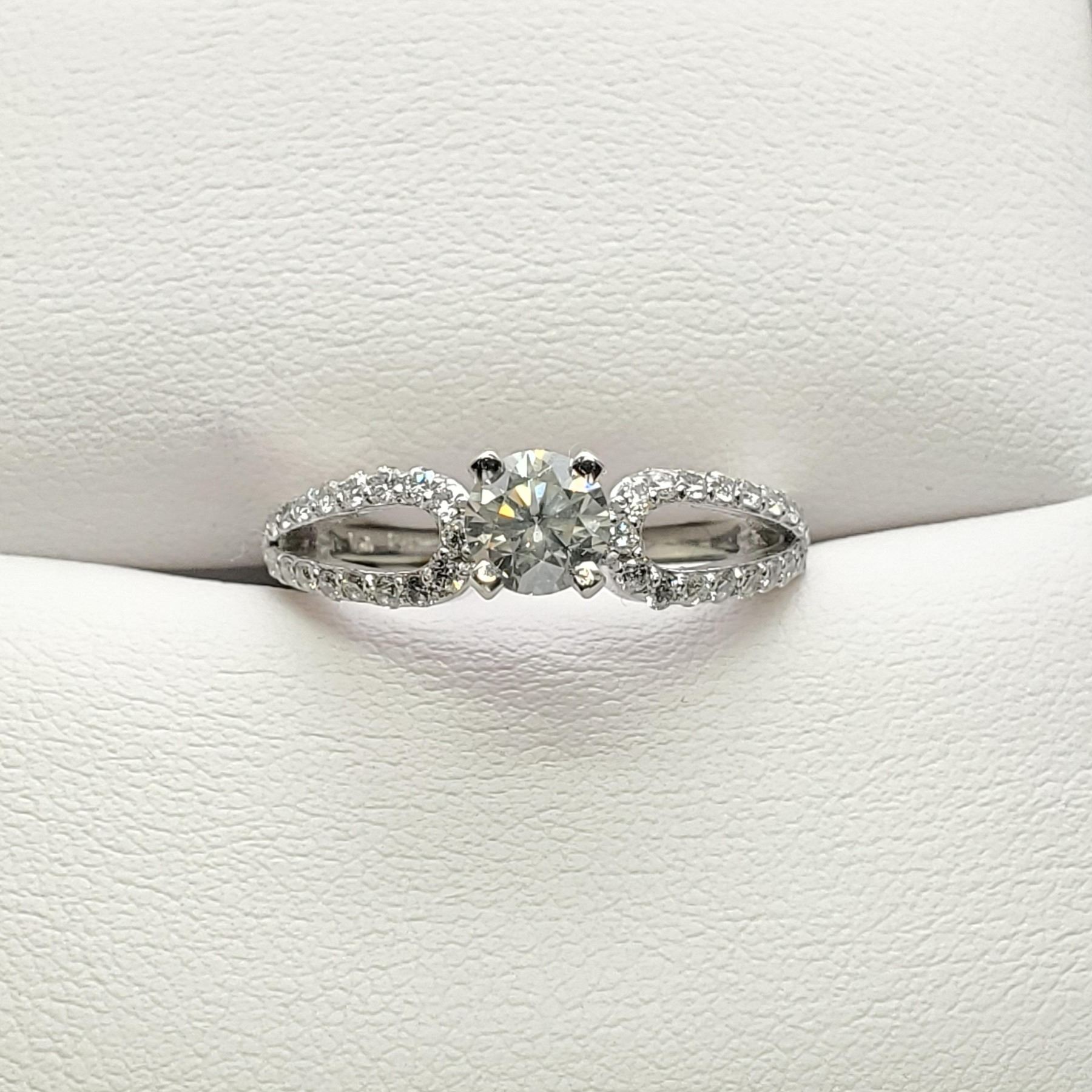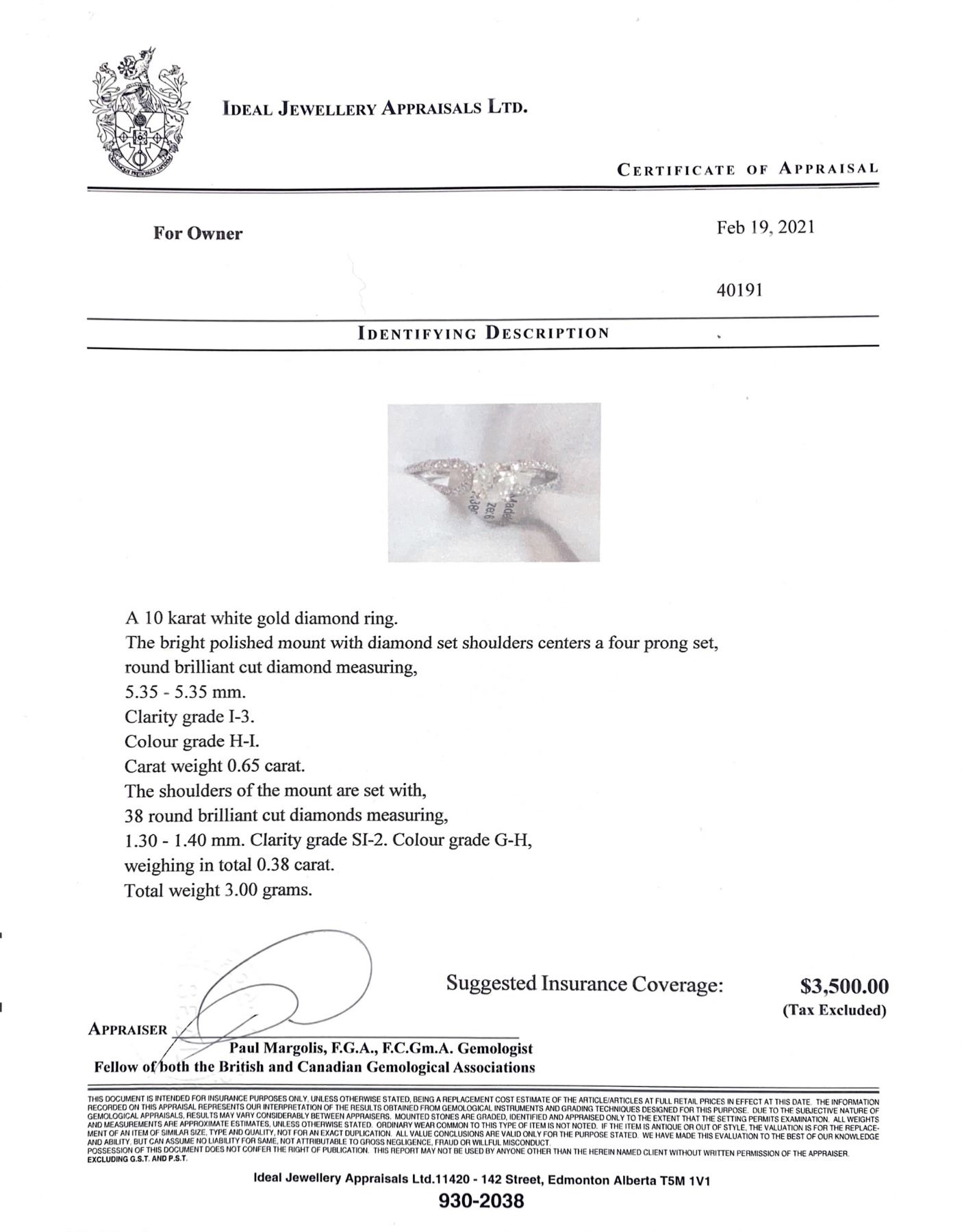 SIZE 6.5 A 10 KARAT WHITE GOLD DIAMOND RING. THE BRIGHT POLISHED MOUNT WITH DIAMOND SET SHOULDERS CENTERS A FOUR PRONG SET, ROUND BRILLIANT CUT DIAMOND MEASURING,S.35- 5.35 MM. CLARITY GRADE 1-3. COLOUR GRADE H-1. CARAT WEIGHT 0.65 CARAT. THE SHOULDERS OF THE MOUNT ARE SET WITH,38 ROUND BRILLIANT CUT DIAMONDS MEASURING. 1.30 - 1.40 MM. CLARITY GRADE SI-2. COLOUR GRADE G-H, WEIGHING IN TOTAL 0.38 CARAT. TOTAL WEIGHT 3.00 GRAMS..CERTIFICATE OF APPRAISAL FROM LOCAL APPRAISER, SUGGESTED INSURANCE COVERAGE $3500.00.