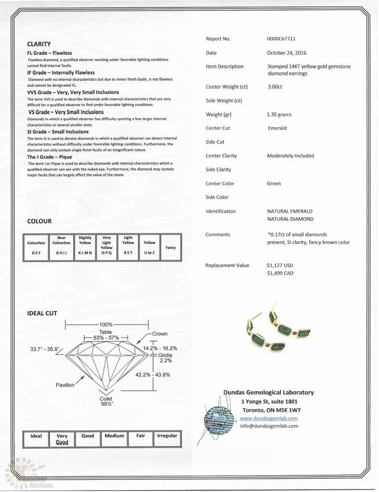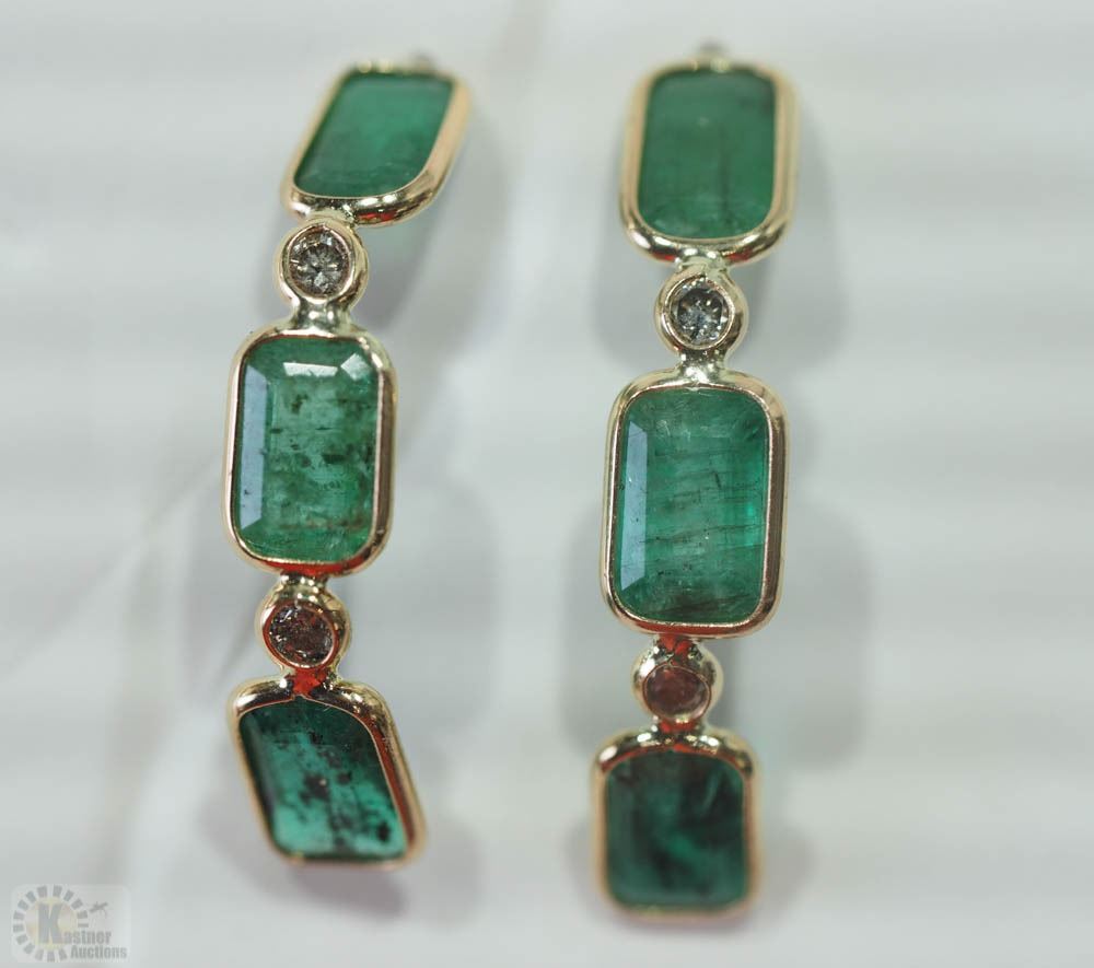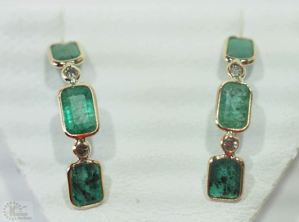 14KT YELLOW GOLD EMERALD (3.00CT) & DIAMOND(0.17CT)EARRINGS W/ COA - SUGGESTED REPLACEMENT VALUE $1,499.00
