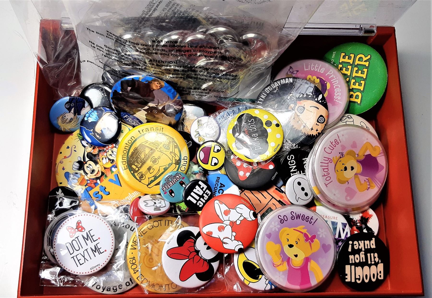 DISNEY & TEEBAGE MUTANT TURTLES PLUS SEVERAL DOZEN PEIN BACKS WITH STICKERS TO MAKE PERSONALIZED BUTTONS. COLLECTIBLES