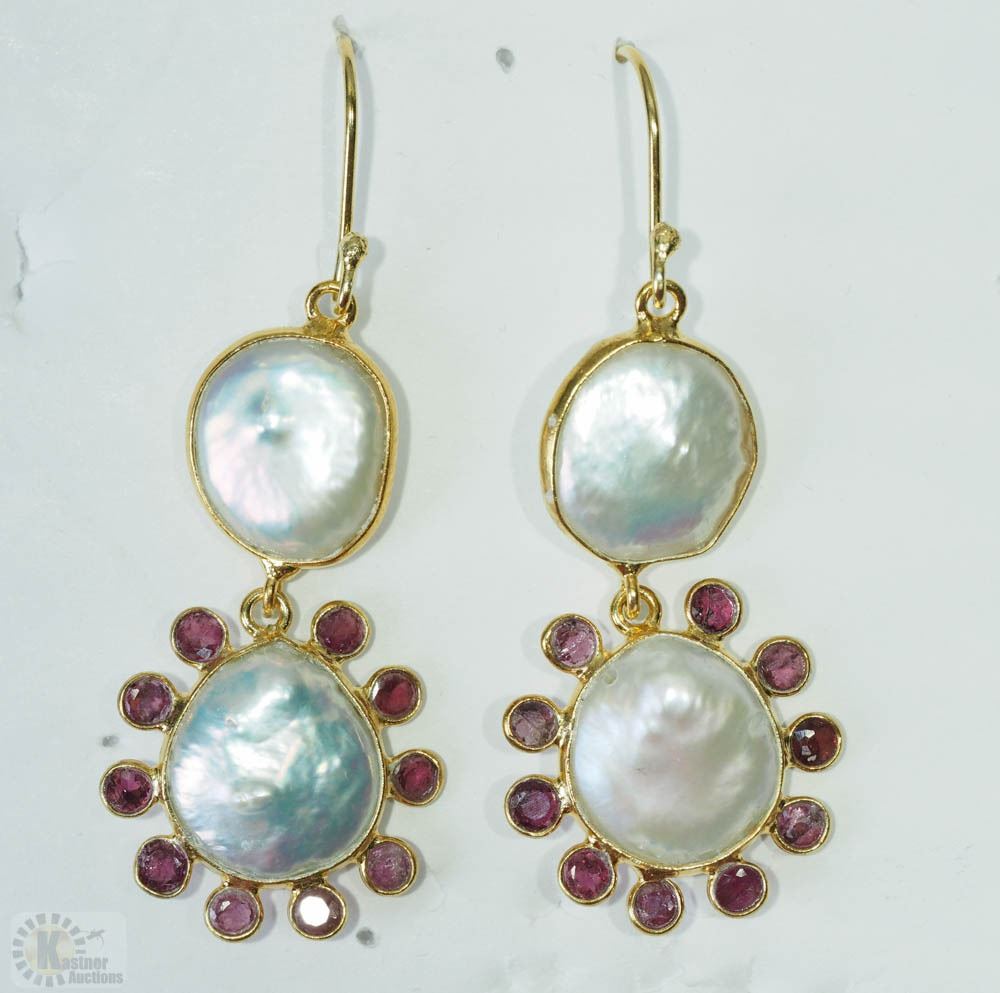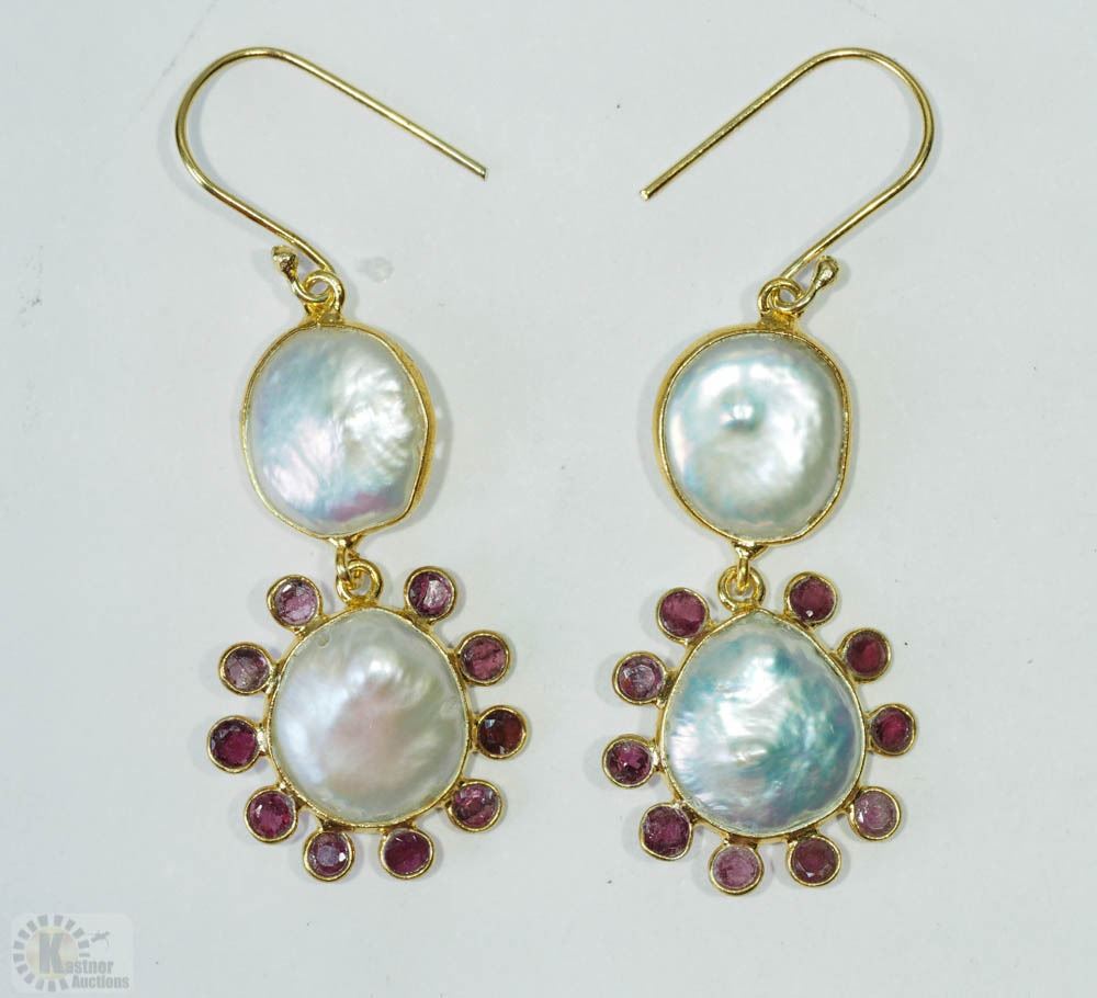 SILVER & GOLD PLATED GARNET & PEARL EARRINGS W/ COA - SUGGESTED REPLACEMENT VALUE $500.00