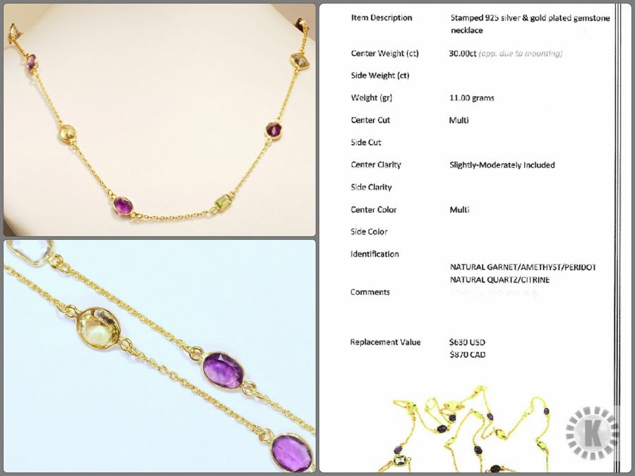 STERLING SILVER GOLD PLATED GARNET, AMETHYST, PERIDOT, QUARTZ, CITRINE NECKLACE - SUGGESTED REPLACEMENT VALUE $870.00