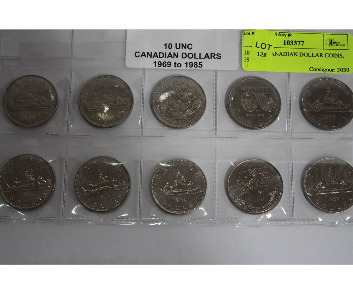 10 UNC. CANADIAN DOLLAR COINS, 1969-1985