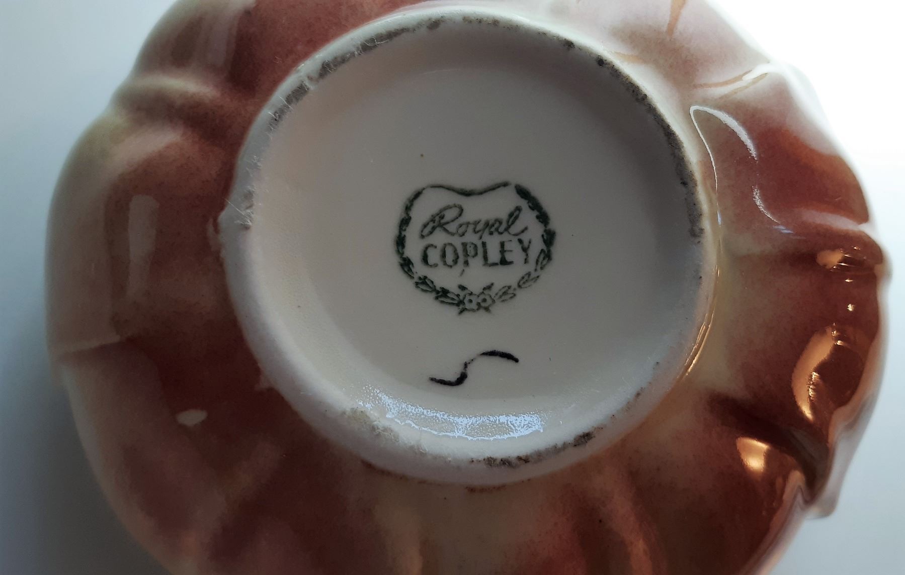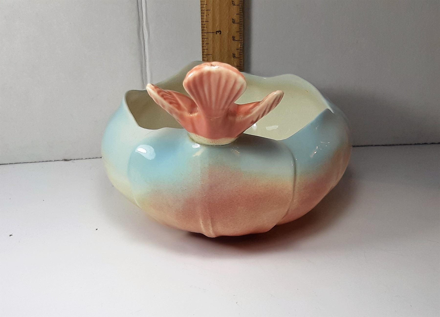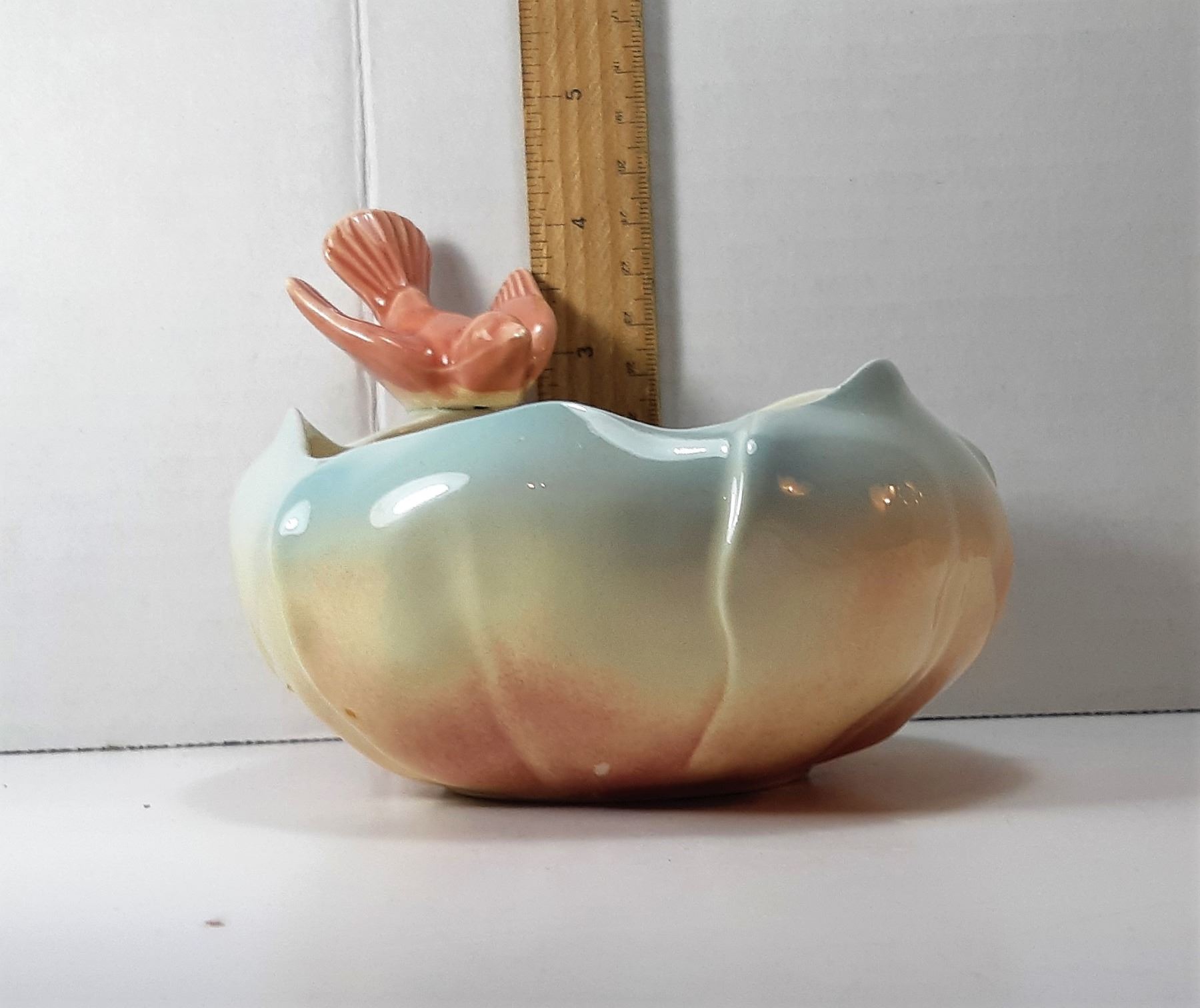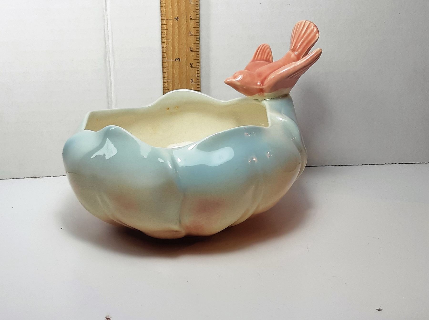 SPAULDING CHINA COMPANY FROM 1939 TO 1960, SMALL PLANTER IN SOFT PASTEL COLORS OF GREEN & ROSE PINK, WITH A BIRD FIGURE. COLLECTIBLES