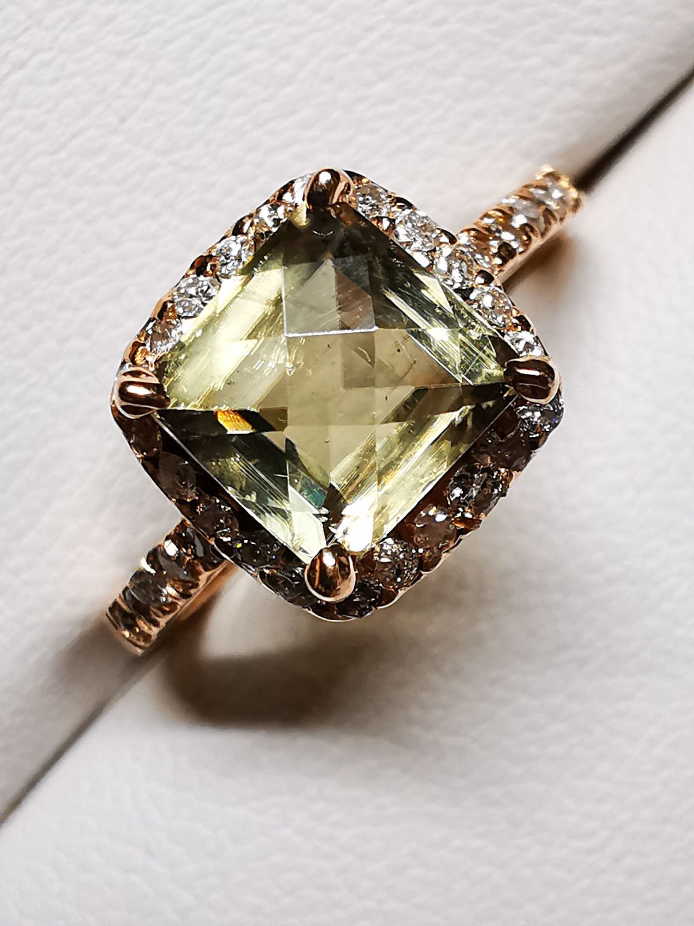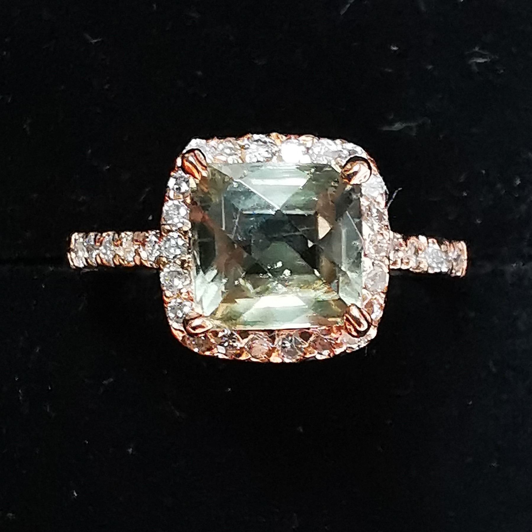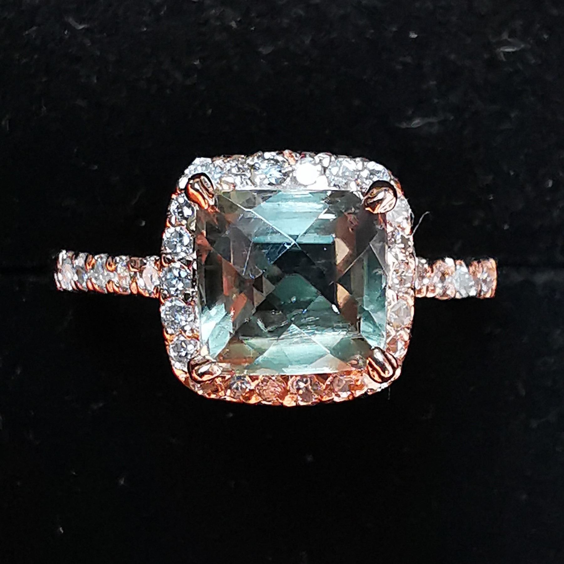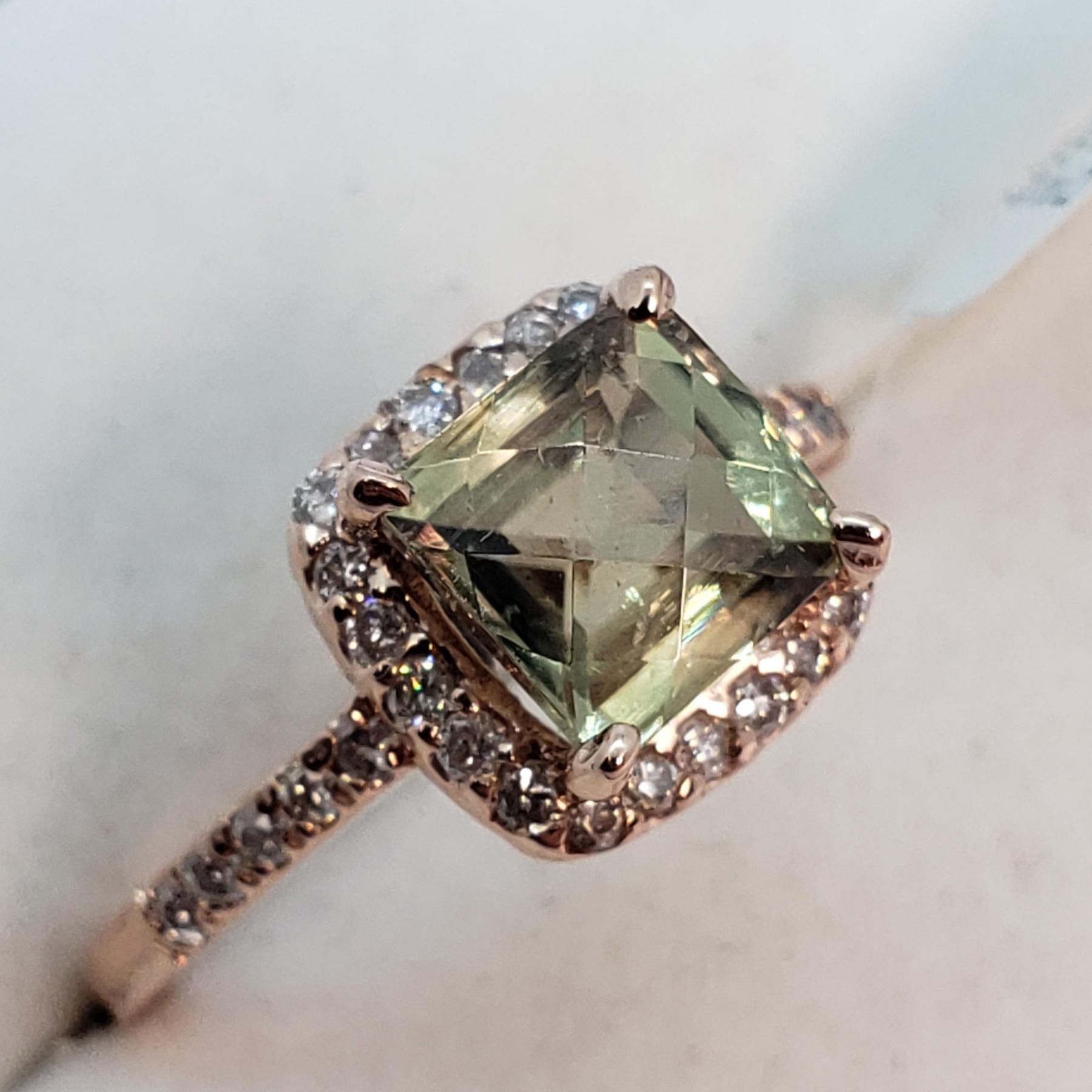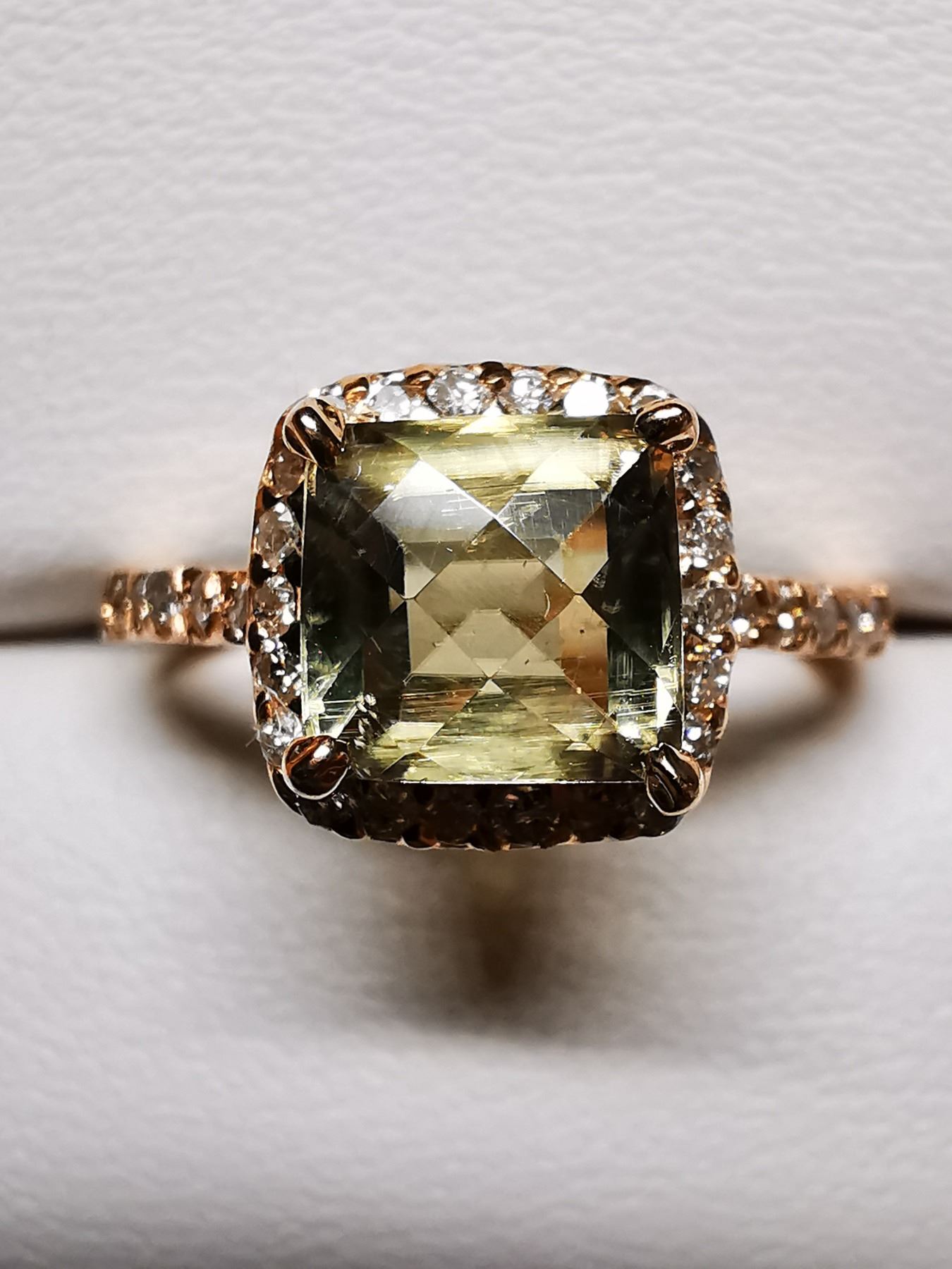 SIZE 6.25, ONE SQUARE SHAPED CHECKER FACETED NATURAL ZULTANITE (MEASURING 6.93 - 6.71 X 4.88 MM, TONE VERY LIGHT, HUE BROWNISH YELLOWISH GREEN, EXTREMELY FAINT COLOR CHANGE, WEIGHING 2.05 CARATS), 32 ROUND BRILLIANT CUT DIAMONDS(MEASURING 1.30 MM, CLARITY GRADE I 1-2, COLOR GRADE H-I, WEIGHING 0.25 CARATS). COMES WITH CERTIFICATE OF APPRAISAL FROM LOCAL APPRAISER. SUGGESTED INSURANCE COVERAGE $1,500.00. JEWELLERY.