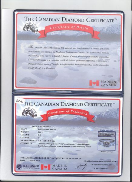1=1.00 cts. ROUND BRILLIANT CUT DIAMOND, I1 CLARITY, F/G COLOR, CANADIAN, EGL CERTIFICATE, RETAIL VALUE $8,980.00