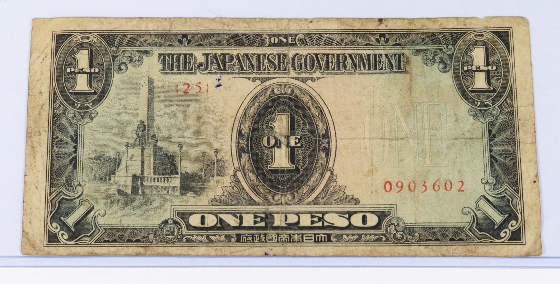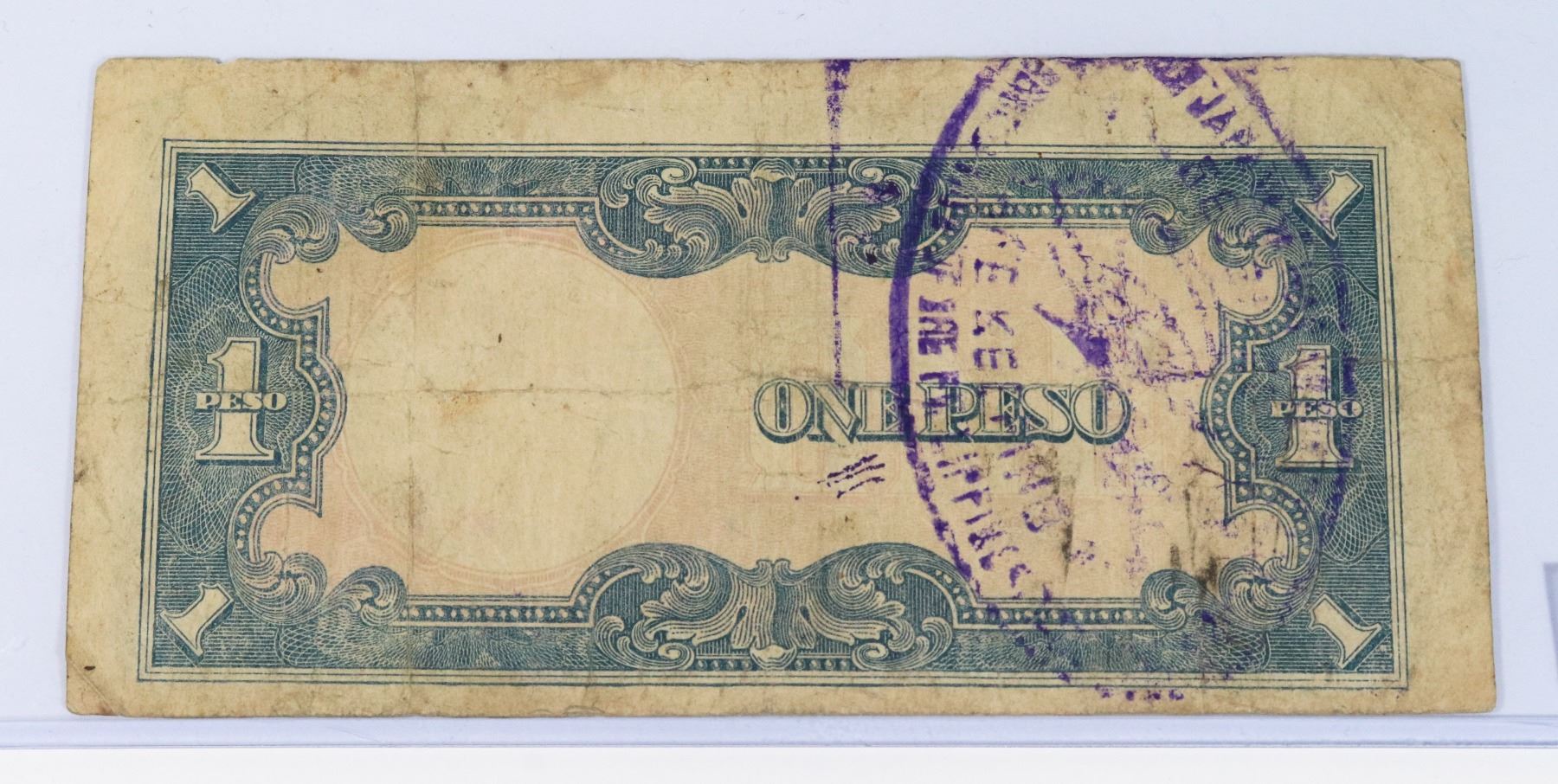 ONE PESO PAPER MONEY BILL WORLD WAR TWO WW2 AXIS FORCES OCCUPATION MONEY JAPANESE EMPIRE REVERSE STAMPED