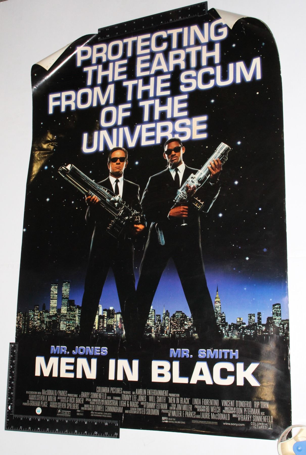 39 x 27 inches in size, heavily worn condition with repairs- requires cleaning. Vintage 1996 Men in Black Movie Poster