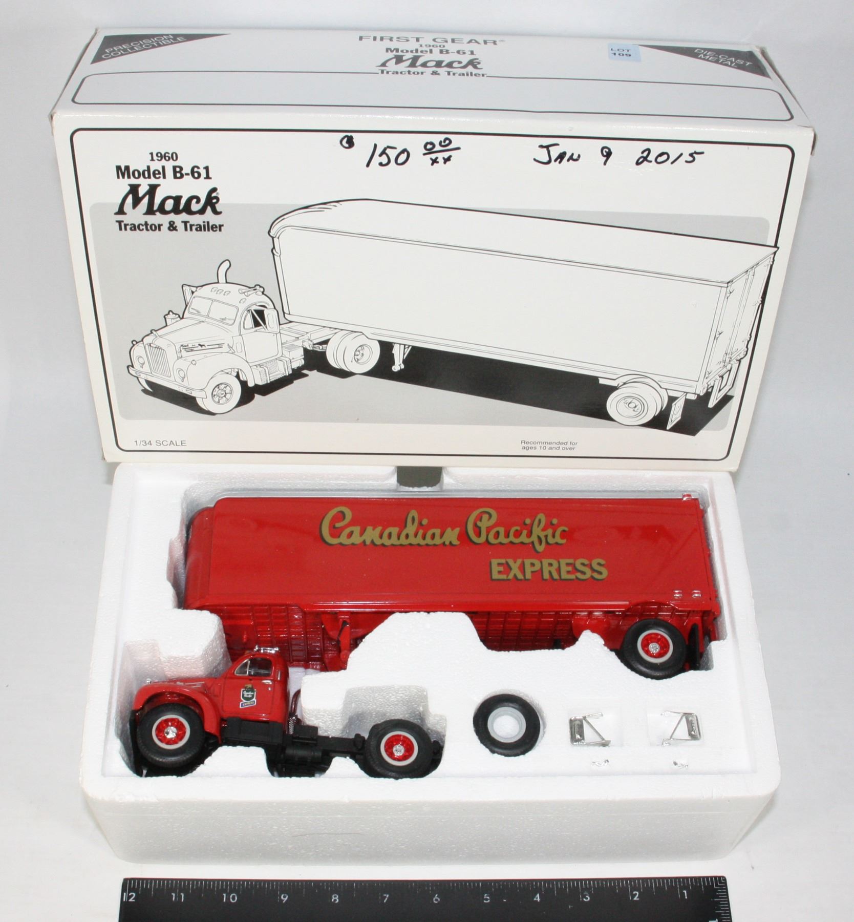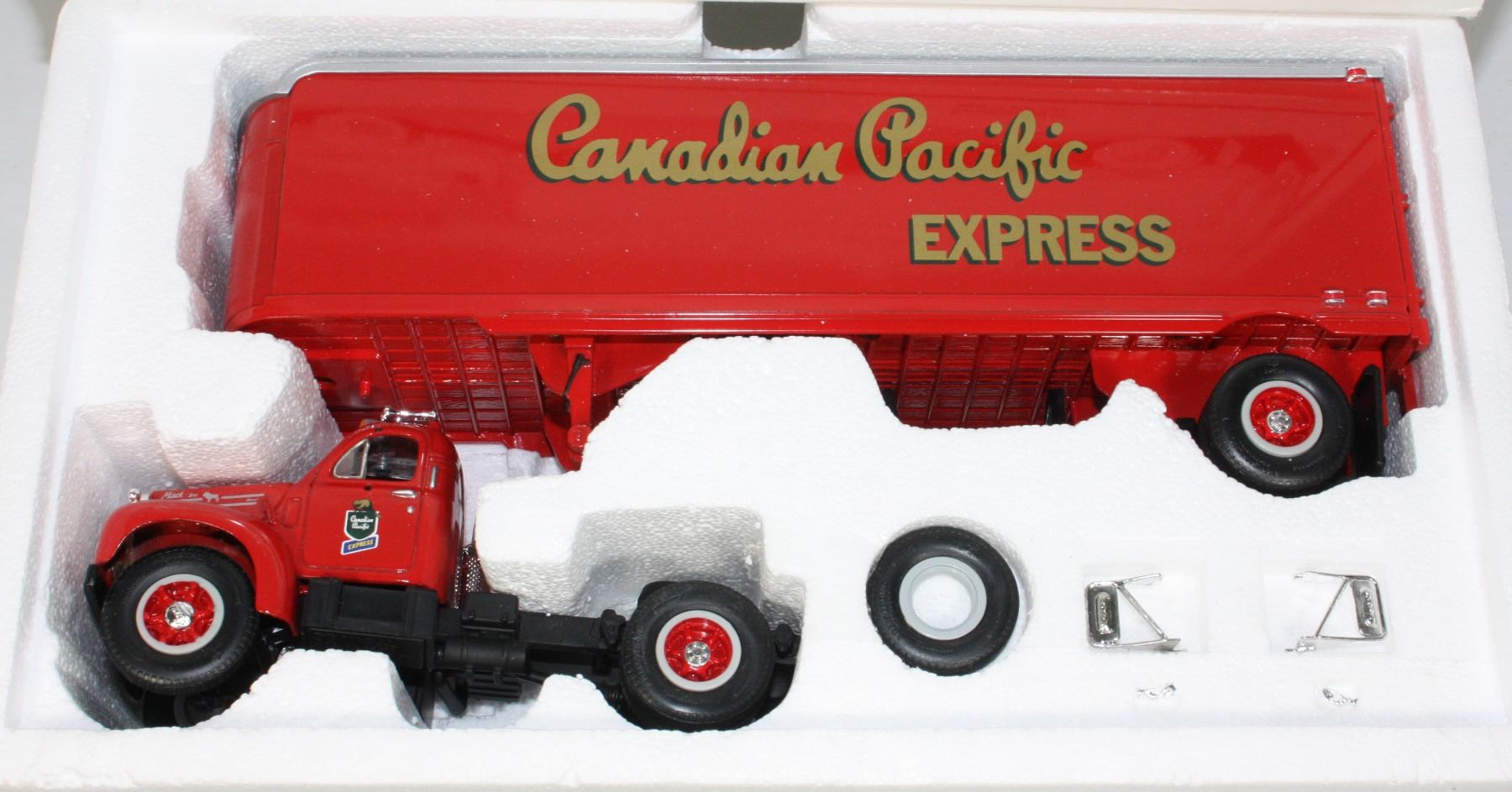 NOS New Old Stock Boxed 1st Gear First Gear Toys 1:34 Scale 1960 Model B-61 Mack Tractor & Trailer "Canadian Pacific Express" Design, wear to one side of box and inner foam. Diecast Die Cast Die-Cast 1993