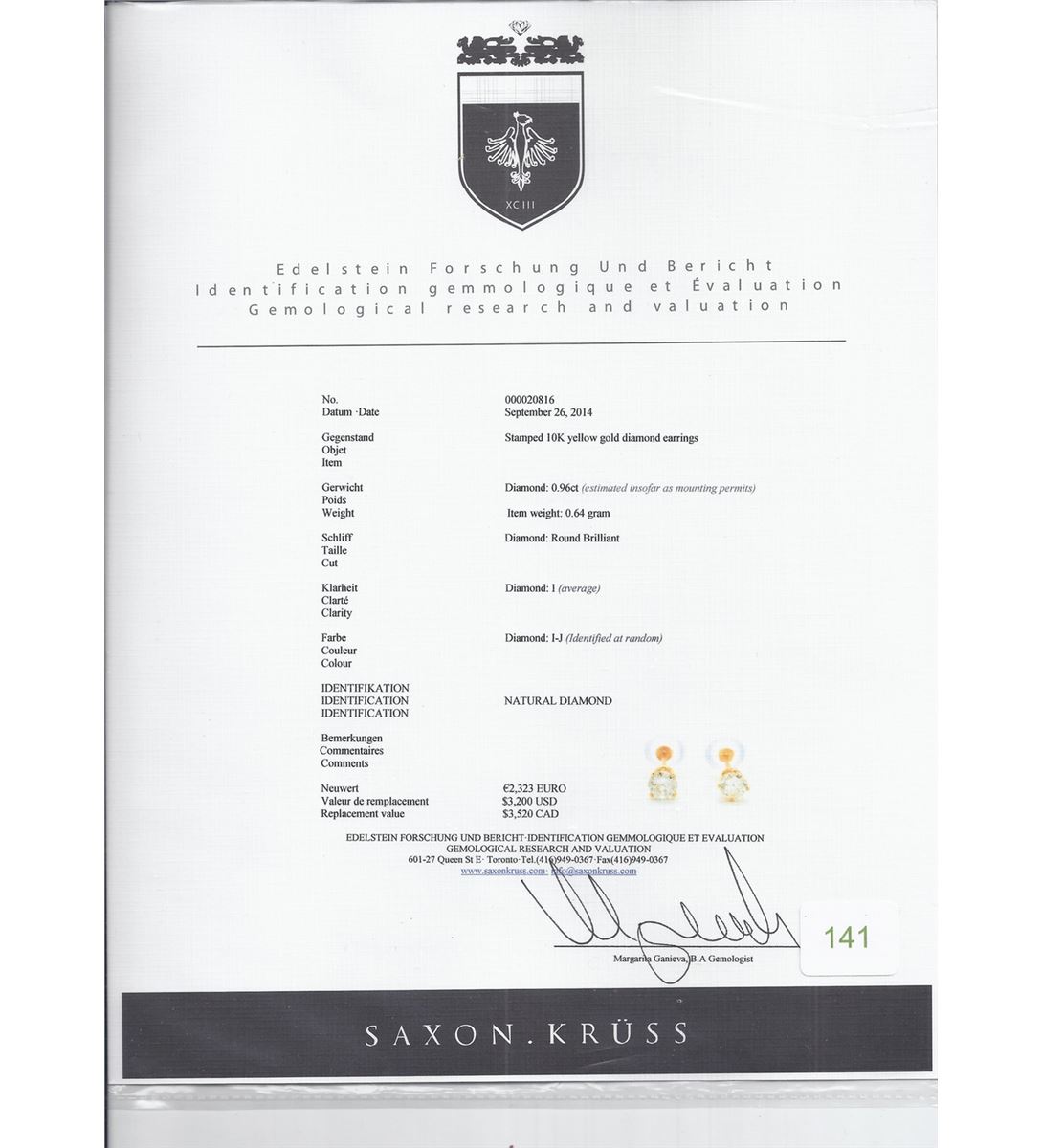 0.96 cts, Round Brilliant Cut, Stud Earrings, I Clarity, I-J Colour, with certificate