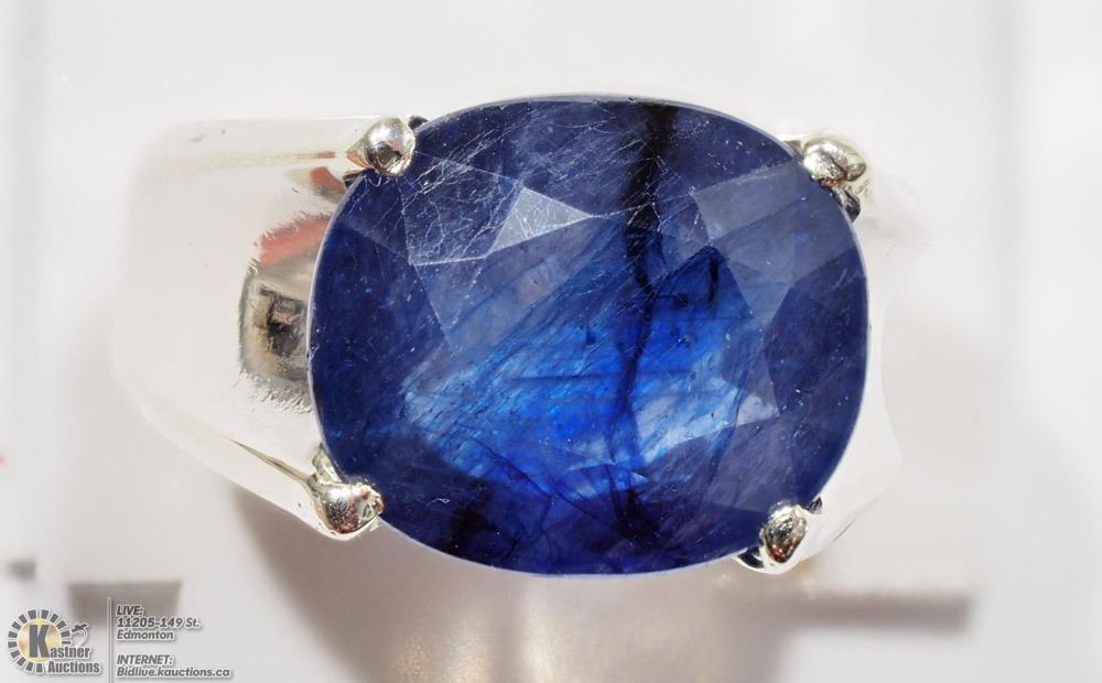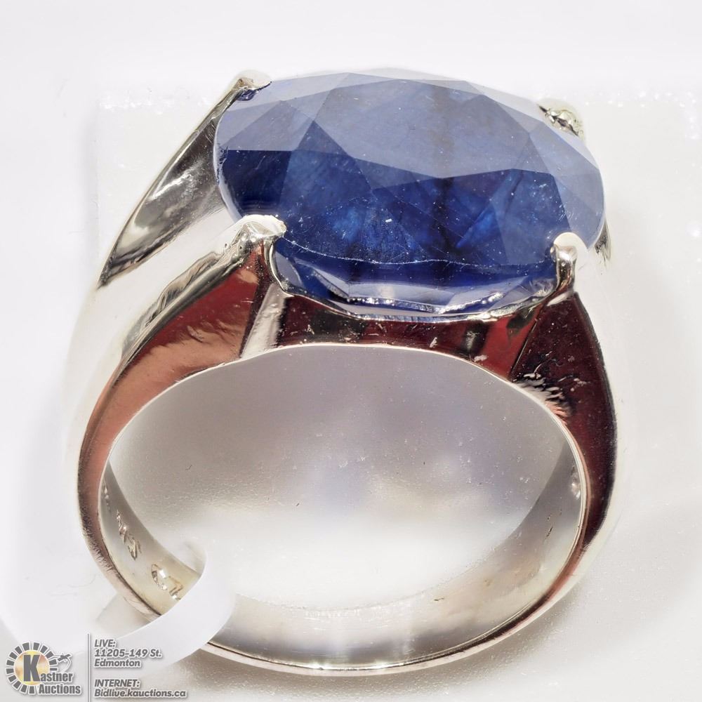 (13 - AC4: R1800) 10K WHITE GOLD LARGE SAPPHIRE(11.0CT) SOLITAIRE HEAVY MEN'S RING (APPROX. 7.16G). W/ COA - SIZE 6. SUGGESTED REPLACEMENT VALUE $4,650.00