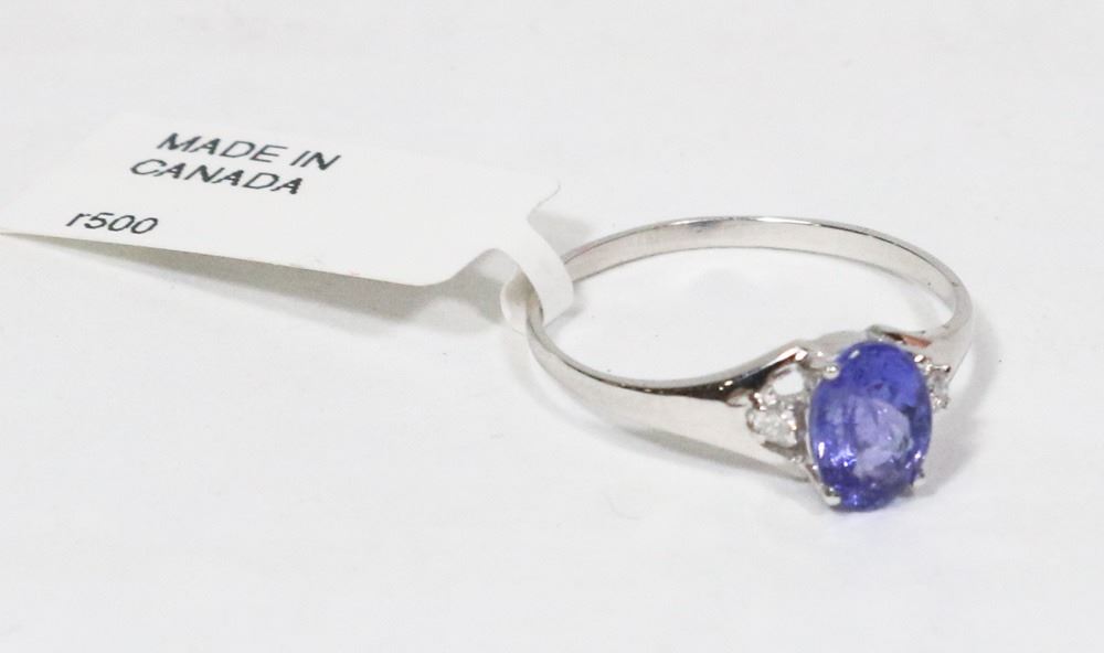 ONE STAMPED 10K WHITE GOLD RING SET WITH 1 OVAL MIX CUT TANZANITE AS CENTER STONE IN FOUR CLAWS SETTING AND 4 ROUND BRILLIANT CUT DIAMONDS AS SIDE STONES IN CLAWS SETTING SIZE 7 WITH COA. REPLACEMENT VALUE: $3,900