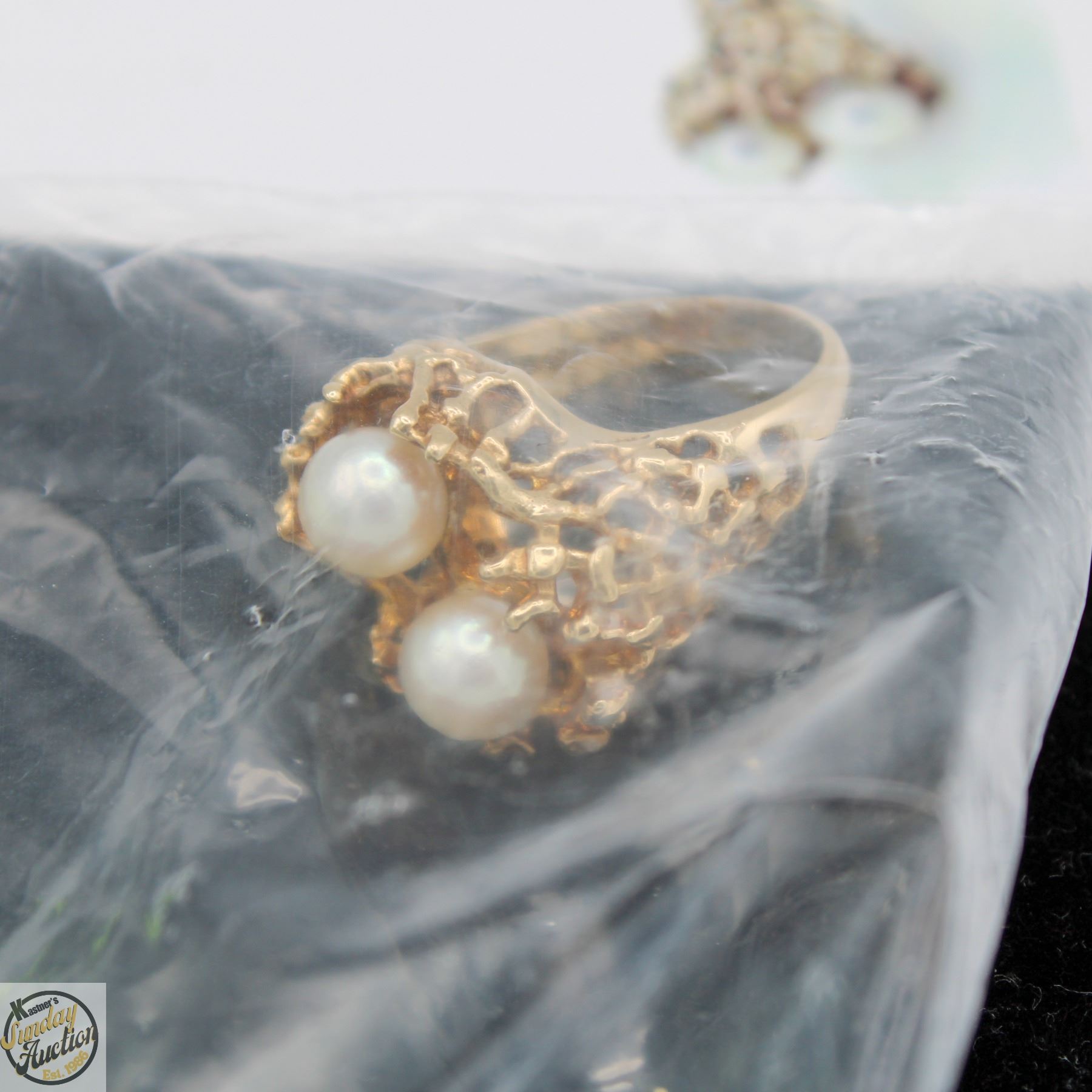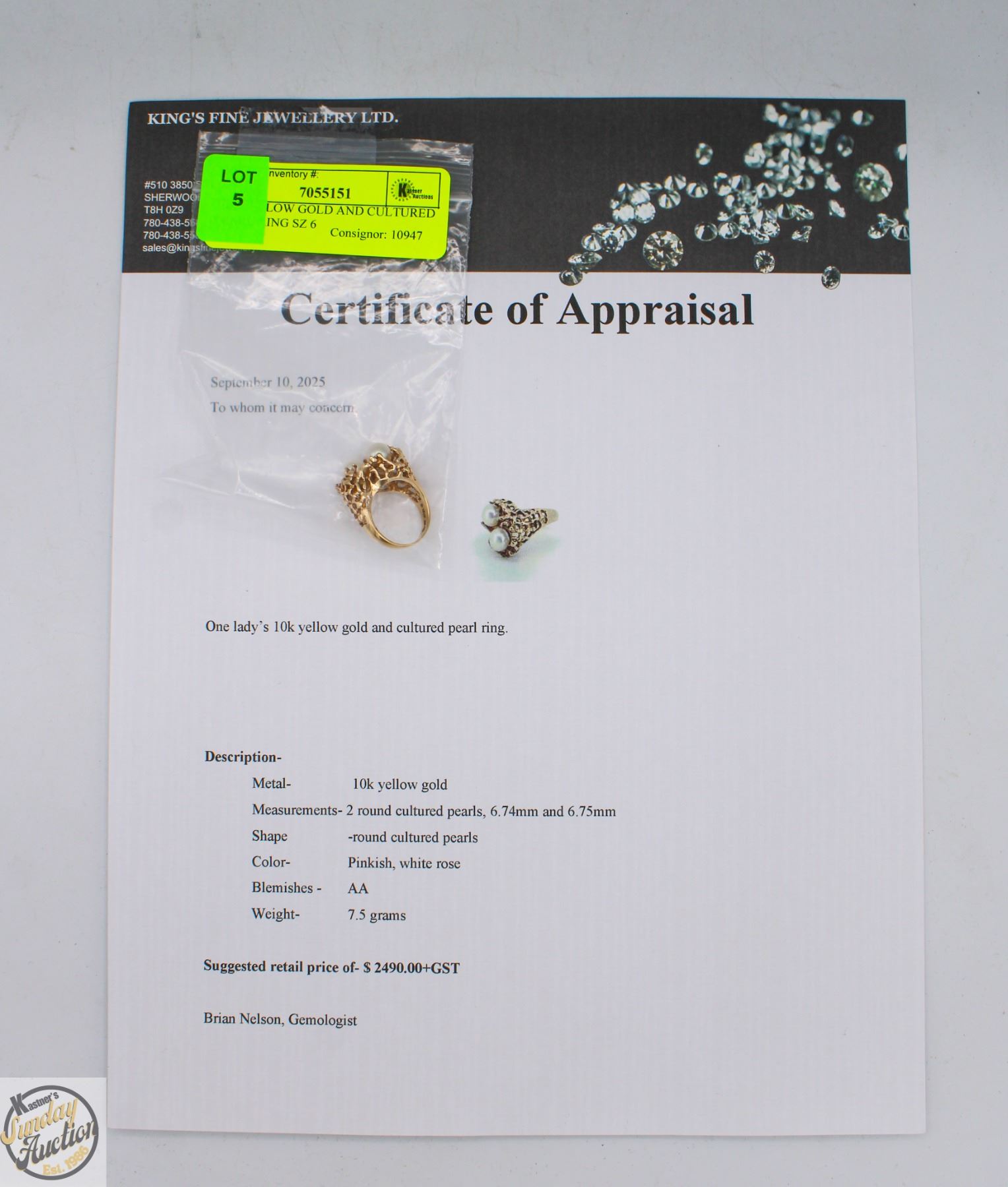 10K YELLOW GOLD, 2 ROUND CULTURED PEARLS MEASURING 6.74MM AND 6.75MM. ROUND CULTURED PEARLS, PINKISH WHITE ROSE, BLEAMISHES ARE AA, WEIGHT 7.5G. COMES WITH APPRAISAL, VALUED AT $2,490.00