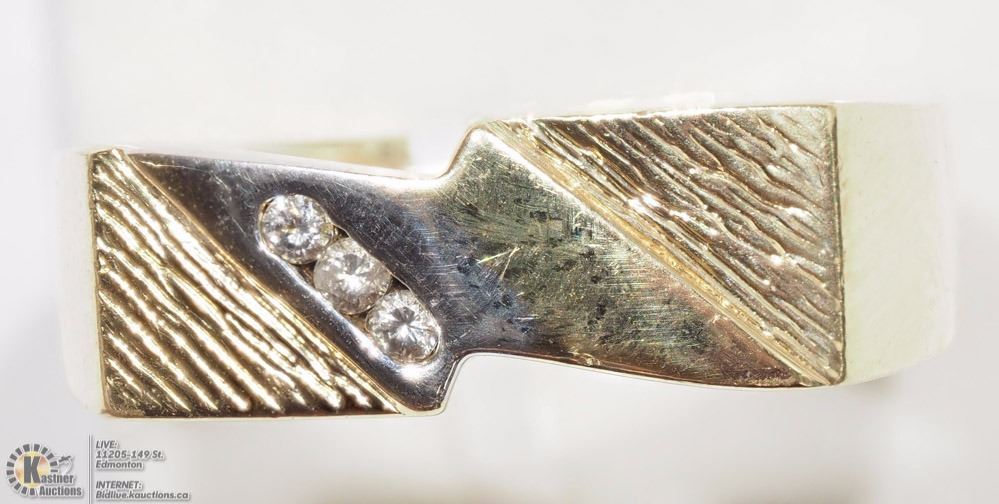 (27 - AC4: R1400) 10K YELLOW GOLD 3 DIAMOND BARK & PLAIN FINISH HEAVY MEN'S RING (APPROX. 6.8G). W/ COA - SUGGESTED REPLACEMENT VALUE $2,750.00