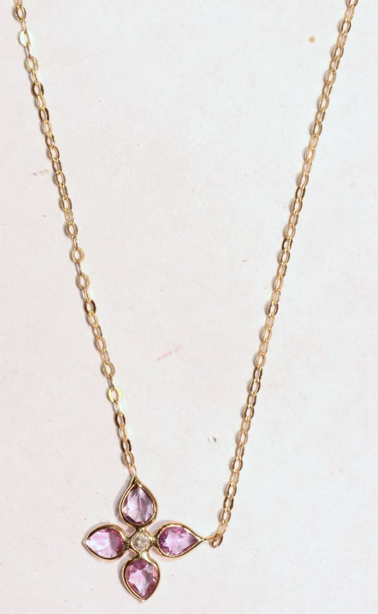 YELLOW GOLD NECKLACE WITH 4 PINK SAPPHIRES (1.0CT) SET AROUND A DIAMOND IN A FLORAL SETTING - SUGGESTED REPLACEMENT VALUE $2,525.00