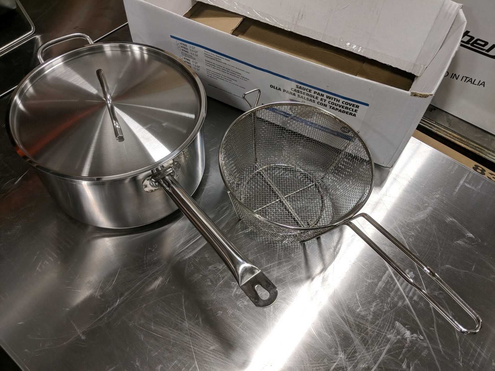 K85 NEW 10QT HEAVY DUTY STAINLESS SAUCE PAN INDUCTION CAPABLE (JR 47702) WITH 9.5" X 5.75", #6 MESH ROUND WIRE FRY BASKET (OMCAN 80381)