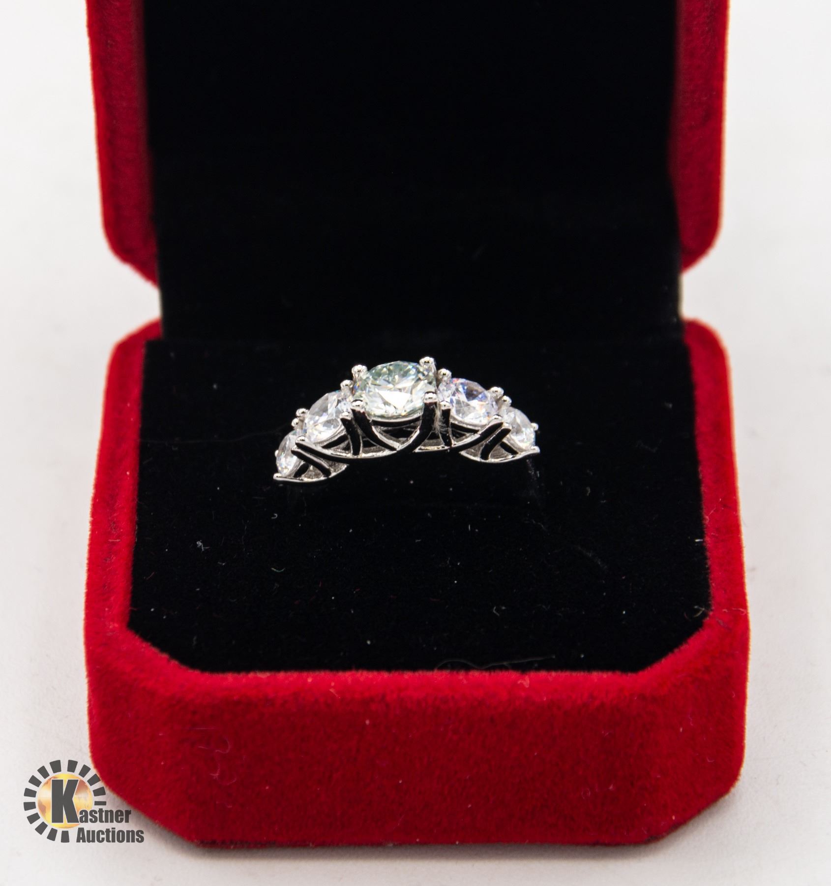 ROUND BRILLIANT MOISSANITE WITH 0.50 CT CUBIC ZIRCONIUM ON EITHER SIDE WITH 0.25 CT BESIDE THESE SET IN STERLING SILVER RING SIZE 6 **ALL ITEMS MUST BE REMOVED BY 5PM SATURDAY, MARCH 30TH 2024. ALL REMAINING ITEMS WILL BE SUBJECT TO A $6.00 PER DAY STORAGE CHARGE. ANY ITEMS REMAINING AFTER MONDAY, APRIL 15TH, 2023 WILL BE CONSIDERED FORFEITED. NO REFUNDS WILL BE ISSUED FOR FORFEITED ITEMS. TO SCHEDULE A PICK UP APPOINTMENT CLICK HERE