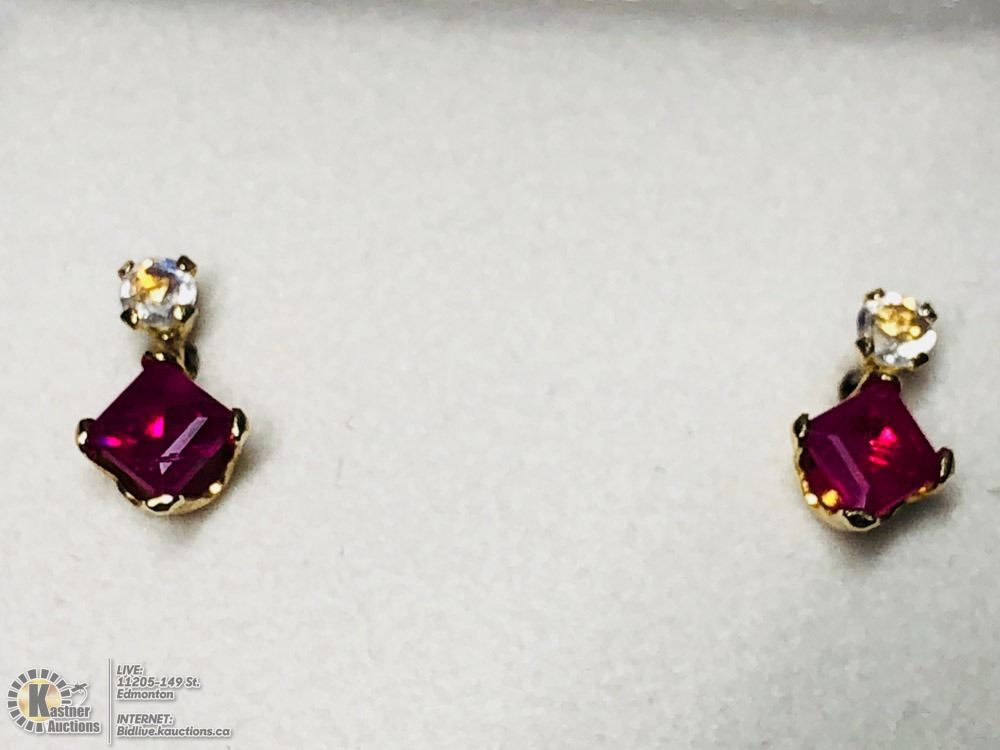61-JP135 - 10KT GOLD MOONSTONE & RUBY EARRINGS, MADE IN CANADA. JEWELLERY