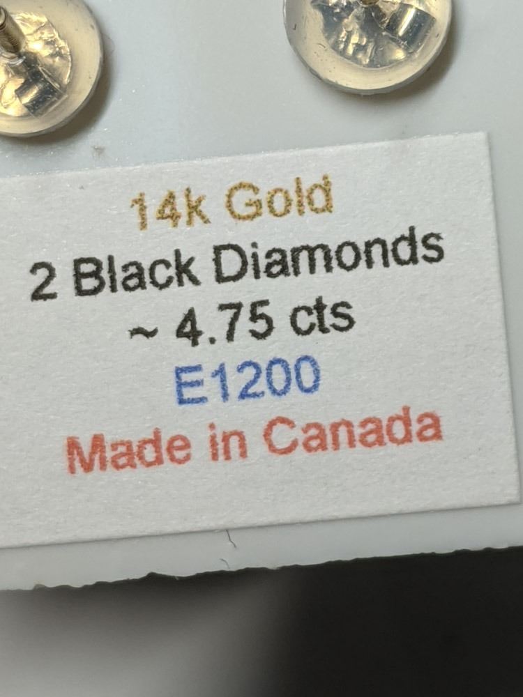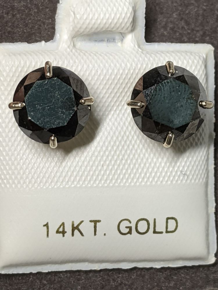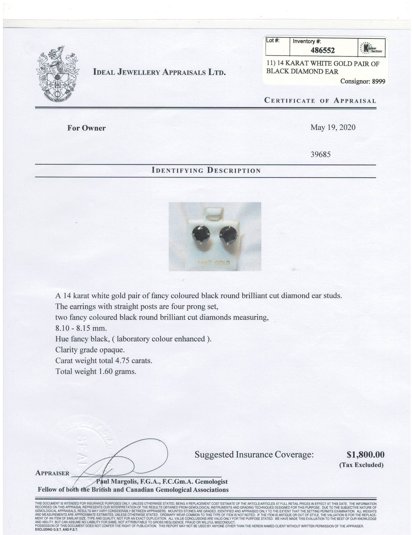 STUDS. TWO FANCY COLOURED BLACK ROUND BRILLIANT CUT DIAMONDS (MEASURING 8.10 - 8.15MM, HUE FANCY BLACK, LABORATORY COLOUR ENHANCED, CLARITY GRADE OPAQUE, WEIGHS 4.75 CARATS). COMES WITH CERTIFICATE OF APPRAISAL FROM LOCAL APPRAISER.SUGGESTED INSURANCE COVERAGE $1,800.00. JEWELLERY