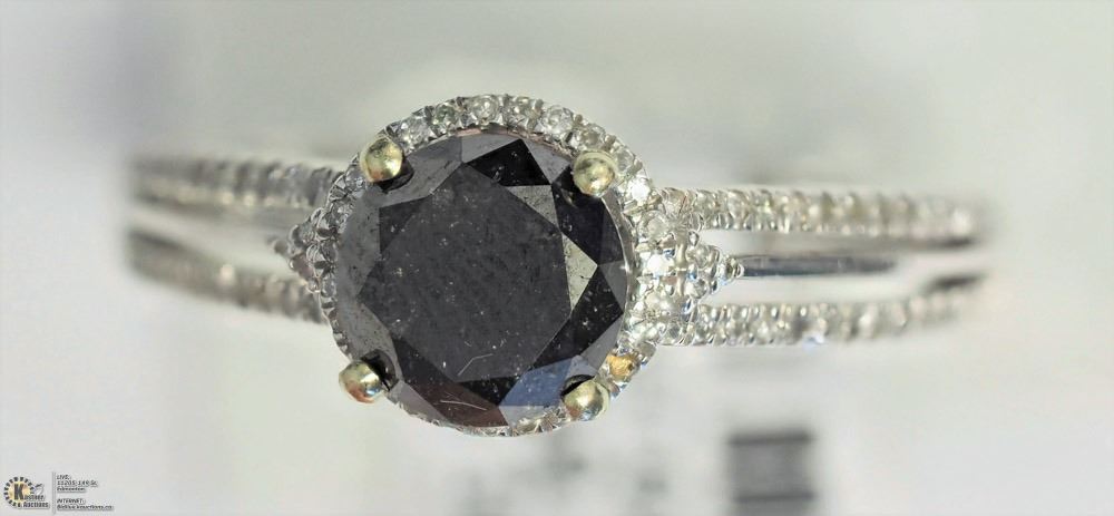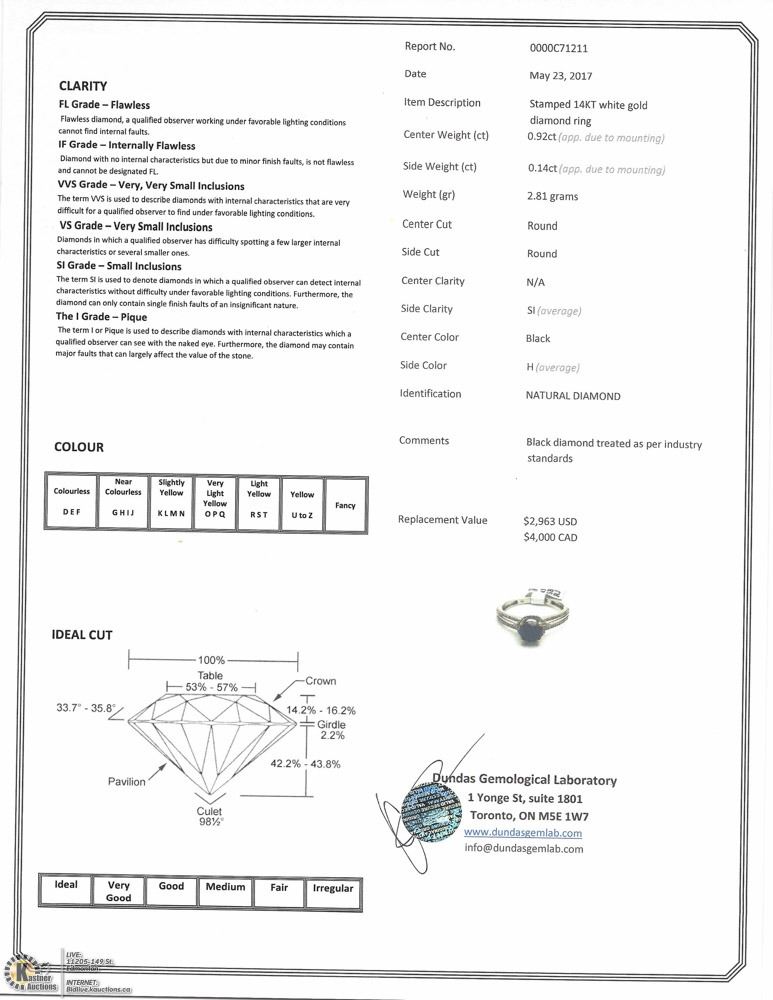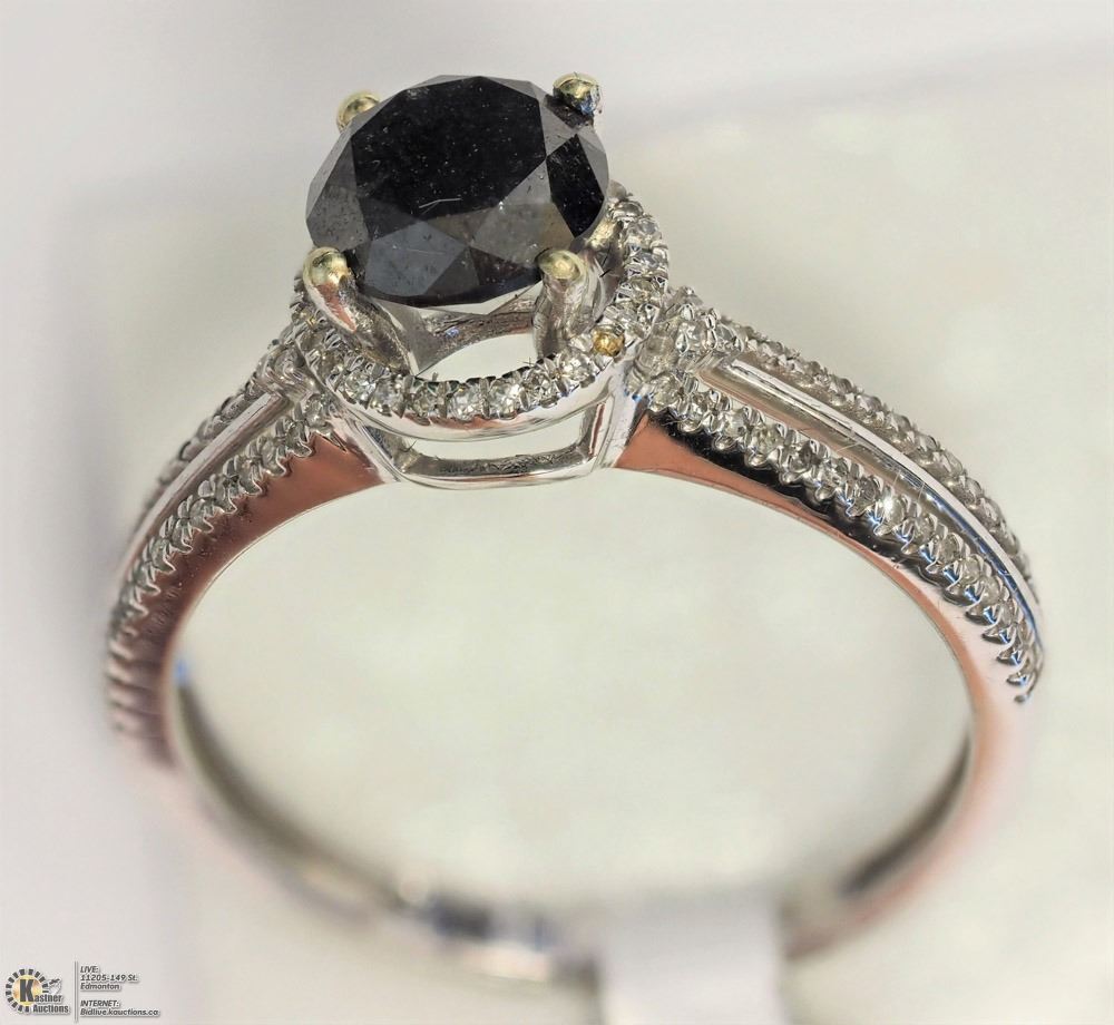 11 - GS55 - 14KT WHITE GOLD BLACK DIAMOND (0.92CT) HALO DESIGN RING SIZE 6.75 WITH 94 SINGLE CUT WHITE DIAMONDS W/COA. SUGGESTED REPLACEMENT VALUE $4,000.00