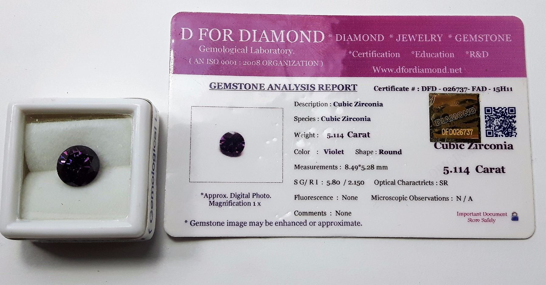 #11 - CZ 5.114 CT ROUND VIOLET GEMSTONE & COA