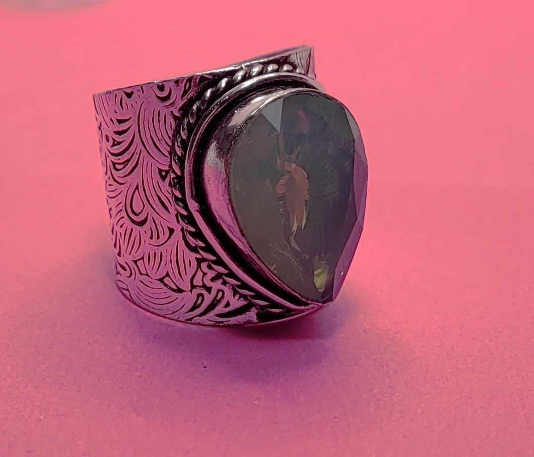 RING SET IN 925 STAMPED SILVER WIDE ETCHED BAND, SIZE 8.5. JEWELLERY