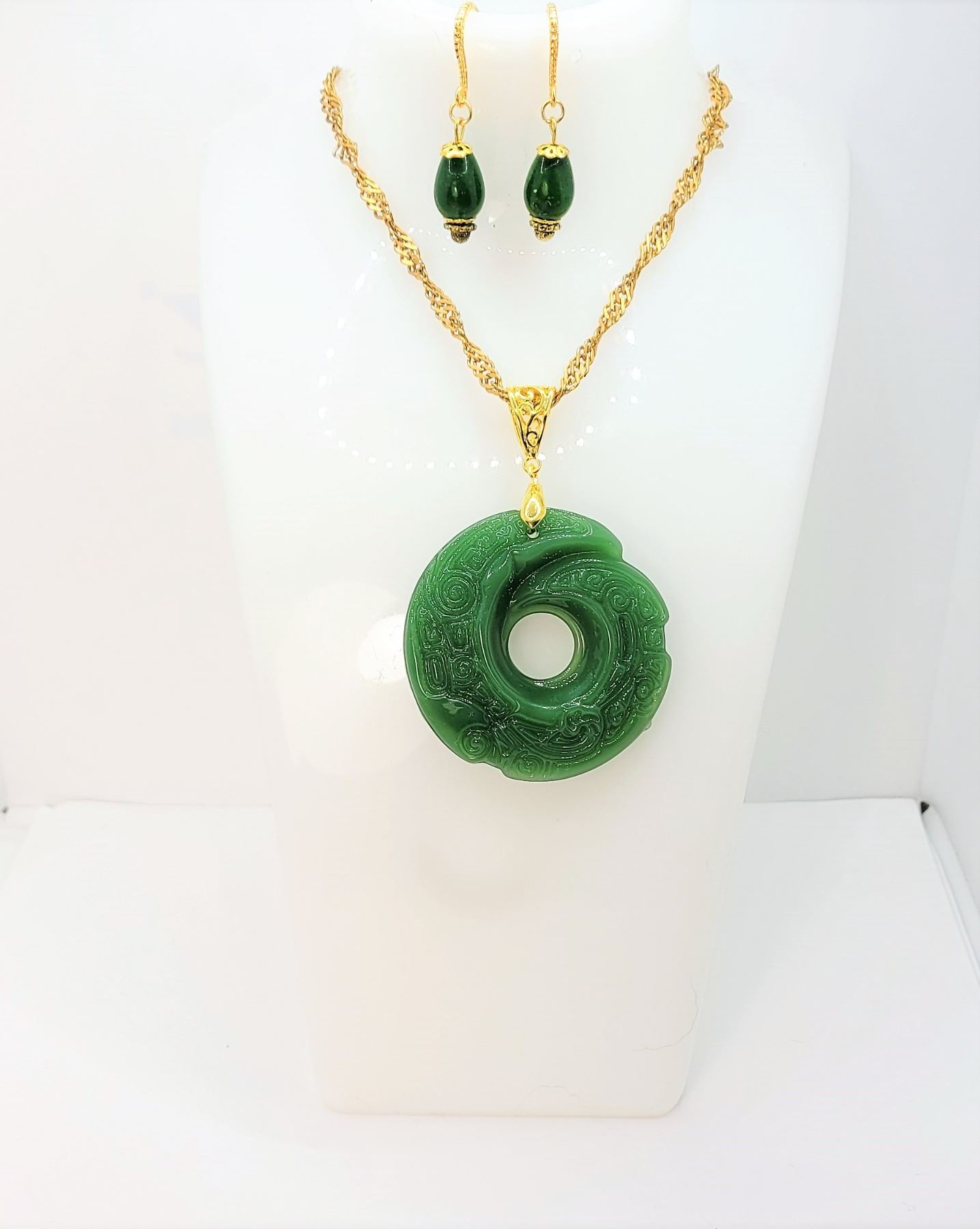 PENDANT ON HEAVY GOLD TONE WAVE CHAIN AND COORDINATING DROP JADE EARRINGS ON GOLD TONE NICKLE FREE WIRES. JEWELRY