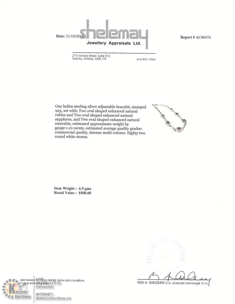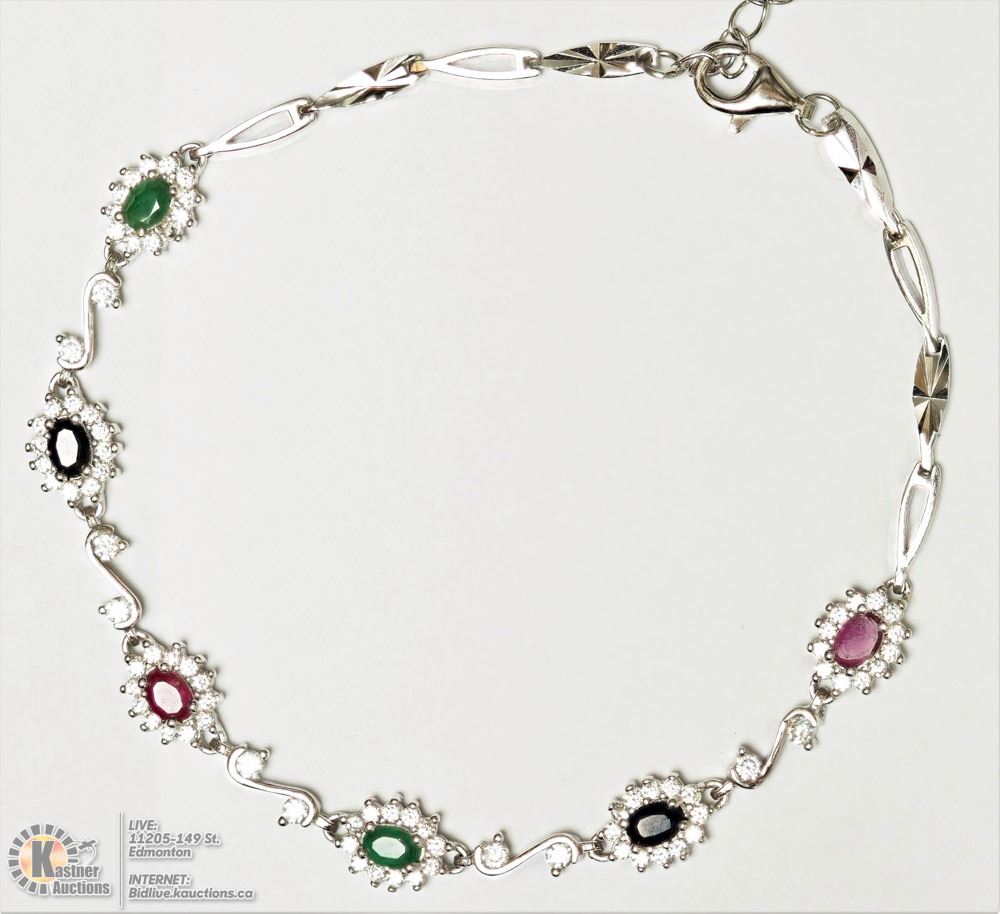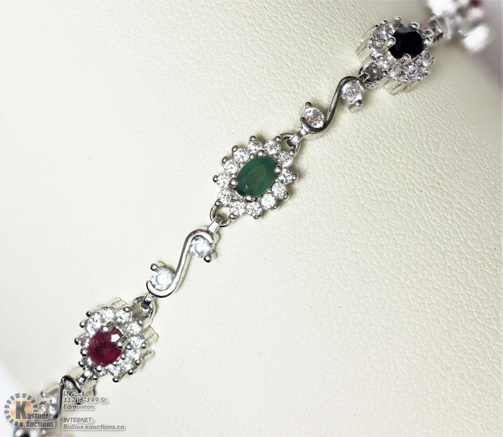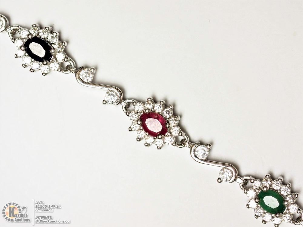 11-NT43-STERLING SILVER EMERALD, SAPPHIRE AND RUBY (1.10CT) ADJUSTABLE BRACELET W/COA. SUGGESTED REPLACEMENT VALUE $500.00