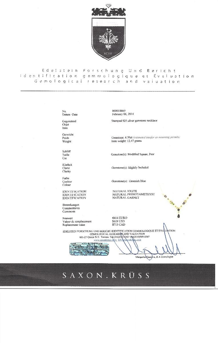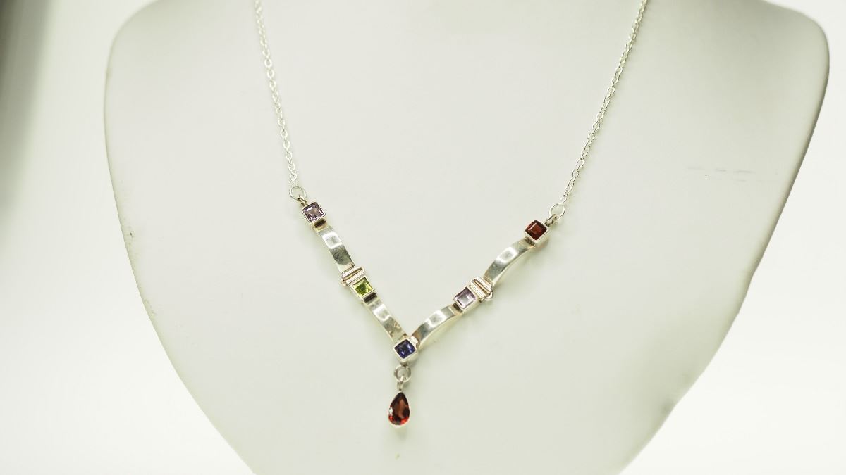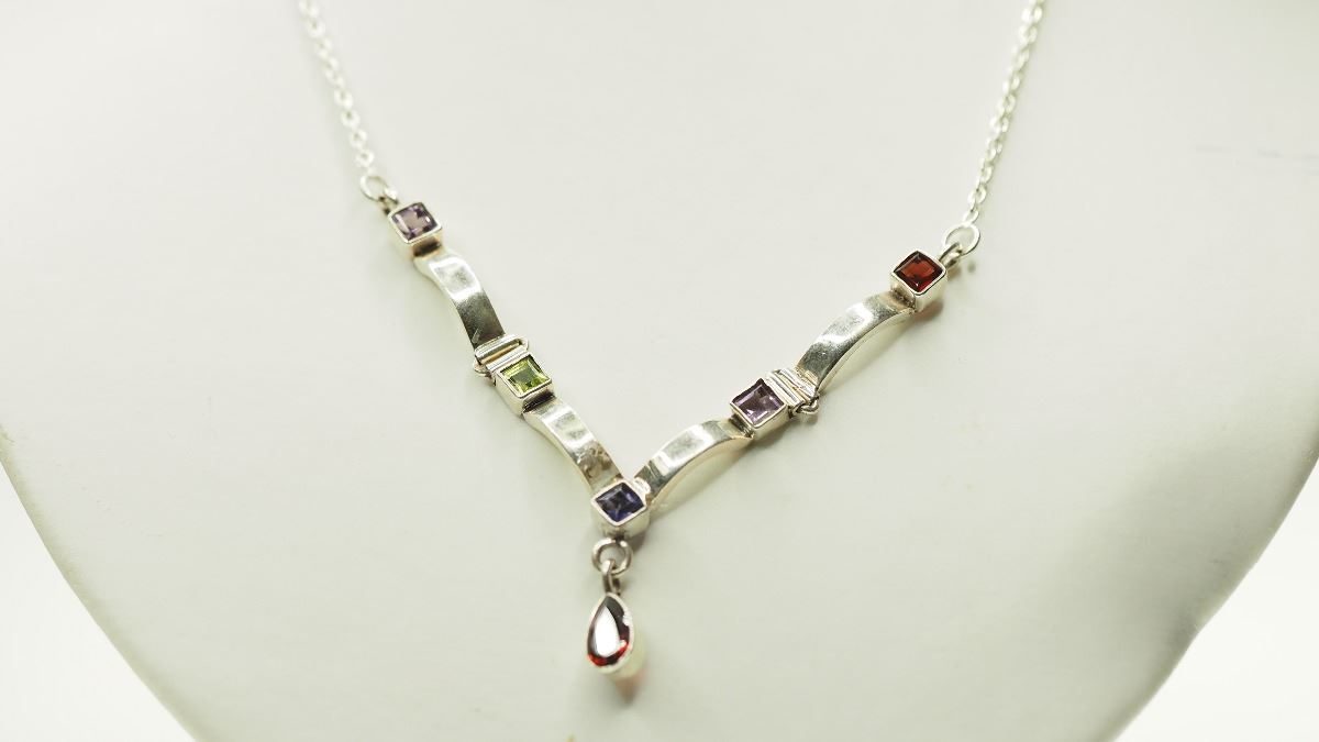 STERLING SILVER IOLITE, PERIDOT, AMETHYST, GARNET NECKLACE. W/ COA- SUGGESTED REPLACEMENT VALUE $713.00