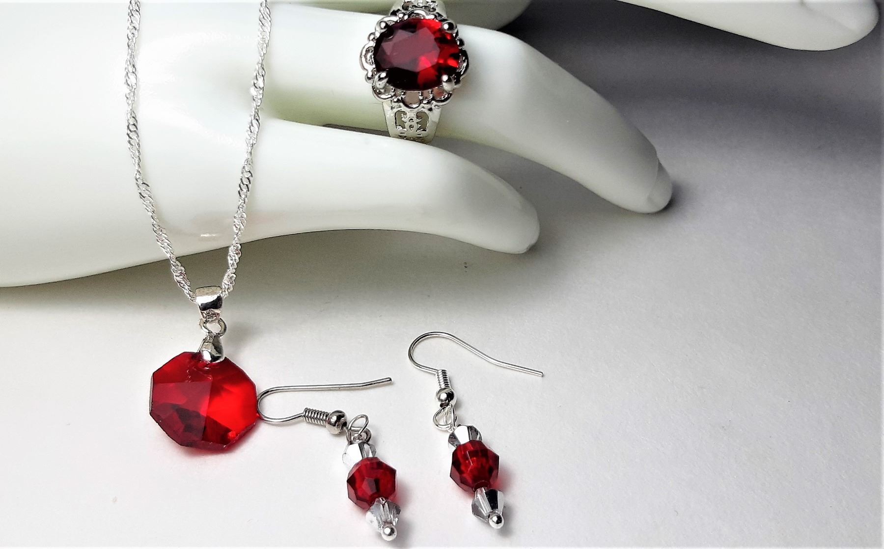 AND SWAROVSKI CRYSTAL EARRINGS, PENDANT ON CHAIN AND SIZE 6.5 RING. JEWELRY