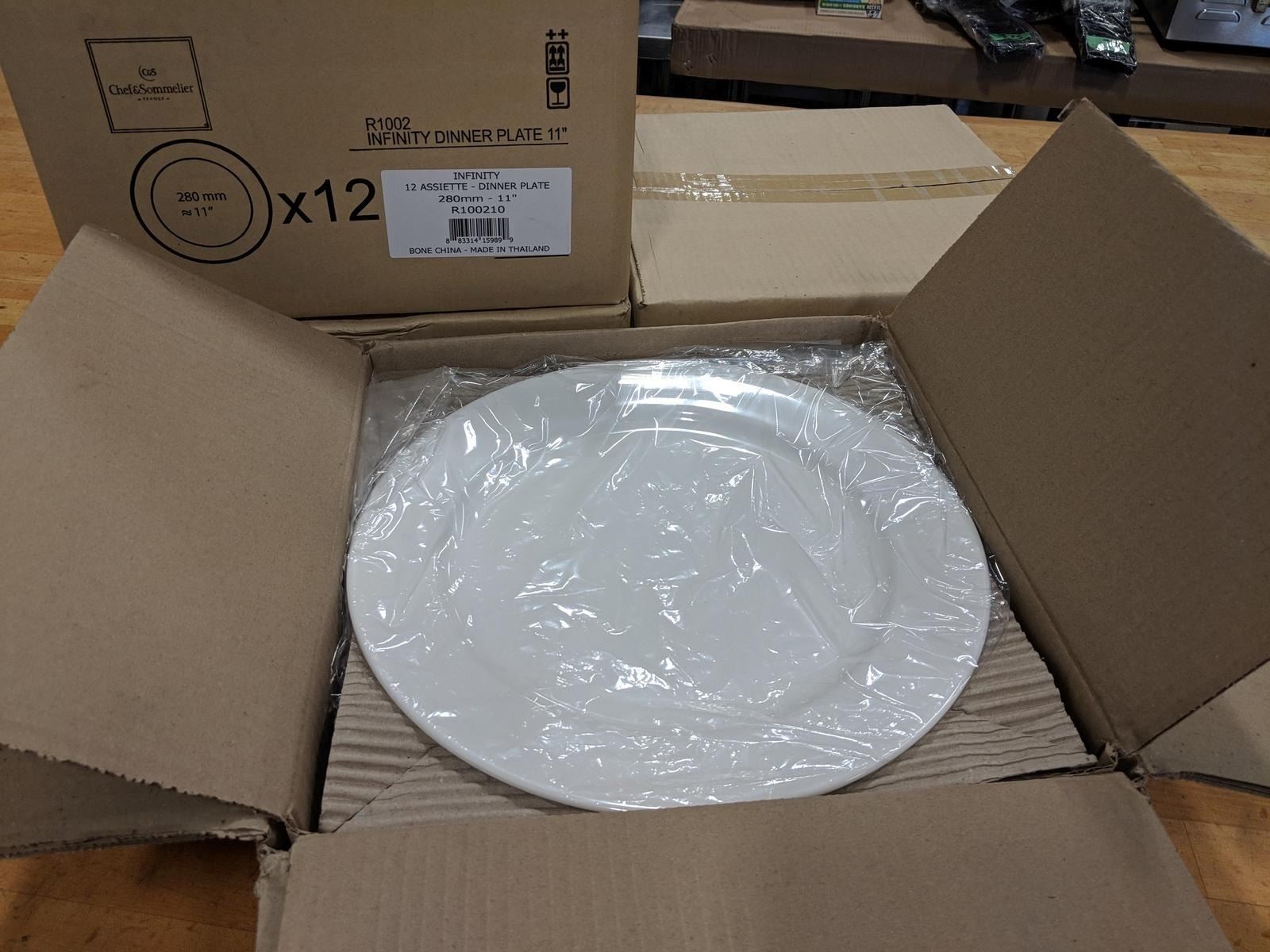 K289-J257 NEW 11" WHITE PORCELAIN DINNER PLATES, ARCOROC "INFINITY" R1002 - LOT OF 12