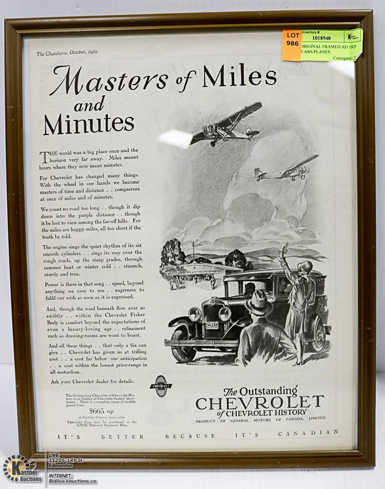 11 X 14 ORIGINAL FRAMED AD 1929 CHEVY CARS/PLANES