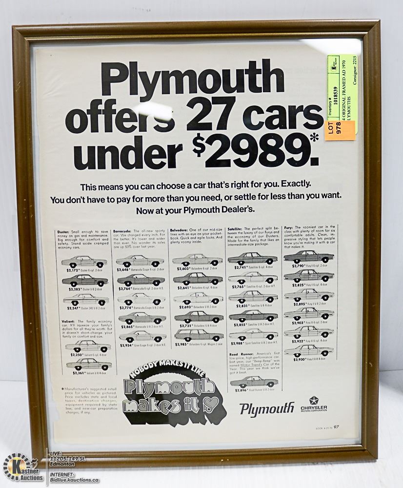 11 X 14 ORIGINAL FRAMED AD 1970 ALL PLYMOUTHS