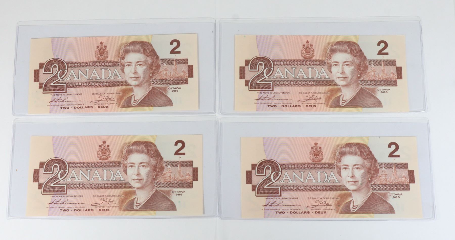 SEQUENTIAL NUMBERS CBD2504173 CBD2504174 CBD2504175 CBD2504176 LOT OF 4 QUEEN ELIZABETH II QEII CANADIAN CANADA PAPER MONEY NOTE 1986