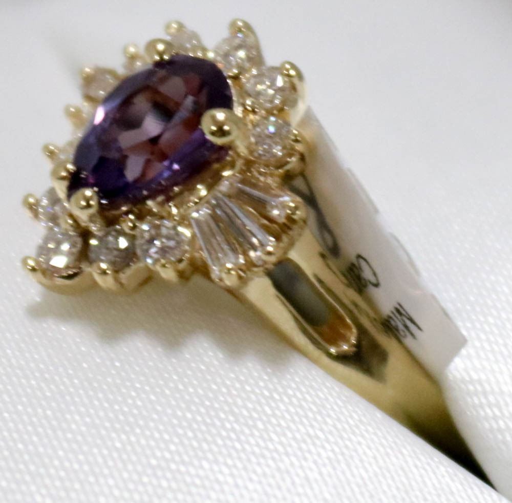 SIZE 9 WITH LOCAL APPRAISAL, SAPPHIRE IS SYNTHETIC COLOR CHANGE IMITATION ALEXANDRITE, CARAT WEIGHT 1.08 CARATS, 9 ROUND BRILLIANT CUT DIAMONDS, CLARITY GRADE I-1, COLOR GRADE I-J, AND 6 TAPERED BAGUETTE CUT DIAMONDS, CLARITY GRADE SI-1, COLORGRADE H-I, TOTAL DIAMOND WEIGHT 0.60 CARATS, TOTAL WEIGHT 4.50 GRAMS. SUGGESTED INSURANCE COVERAGE $2,300.00. JEWELLERY