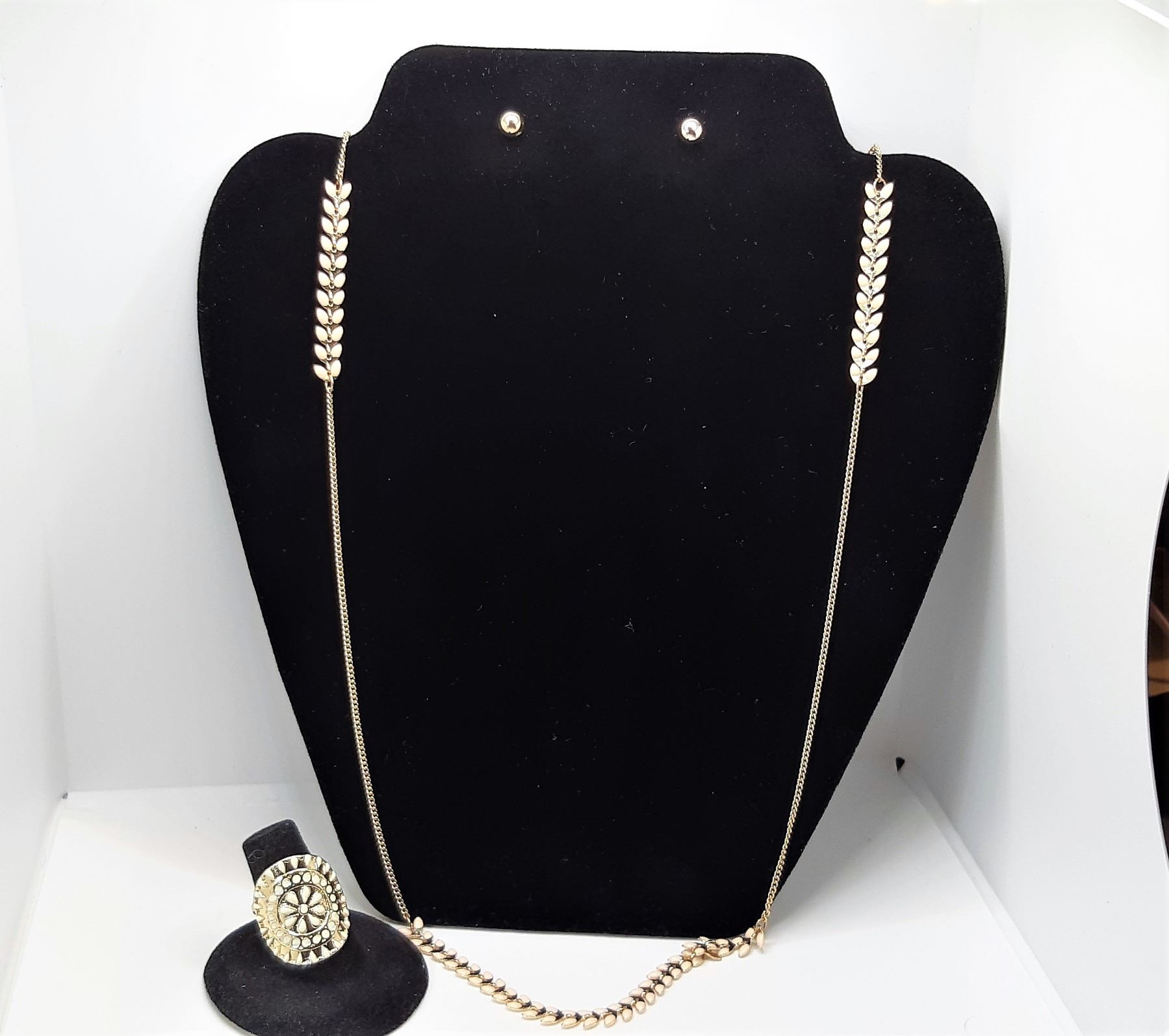 ENAMEL 34" LONG NECKLACE, GOLD TONE BALL STUD EARRINGS AND COORDINATING RING, SIZE 7. JEWELRY